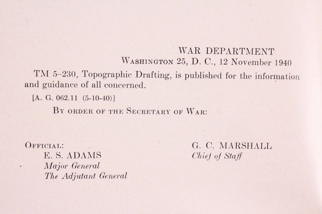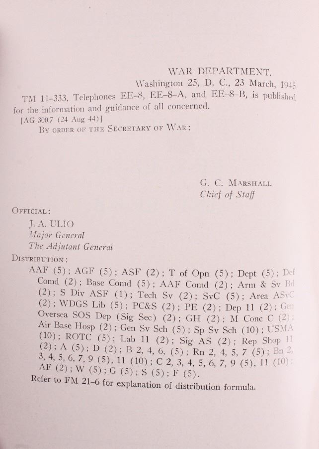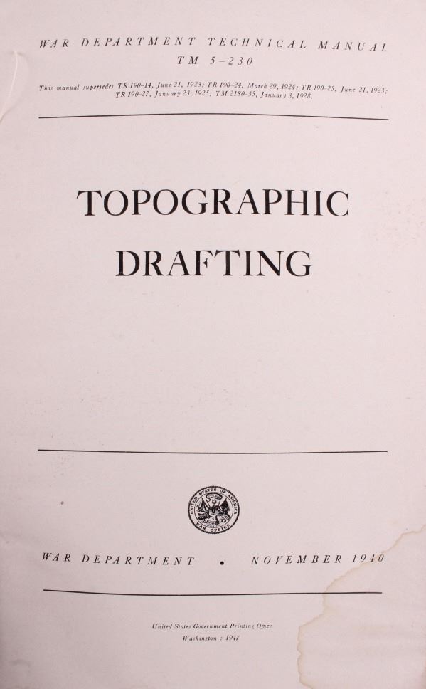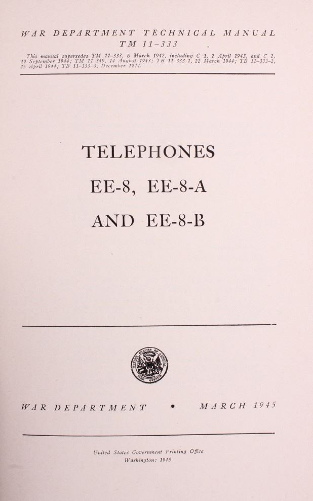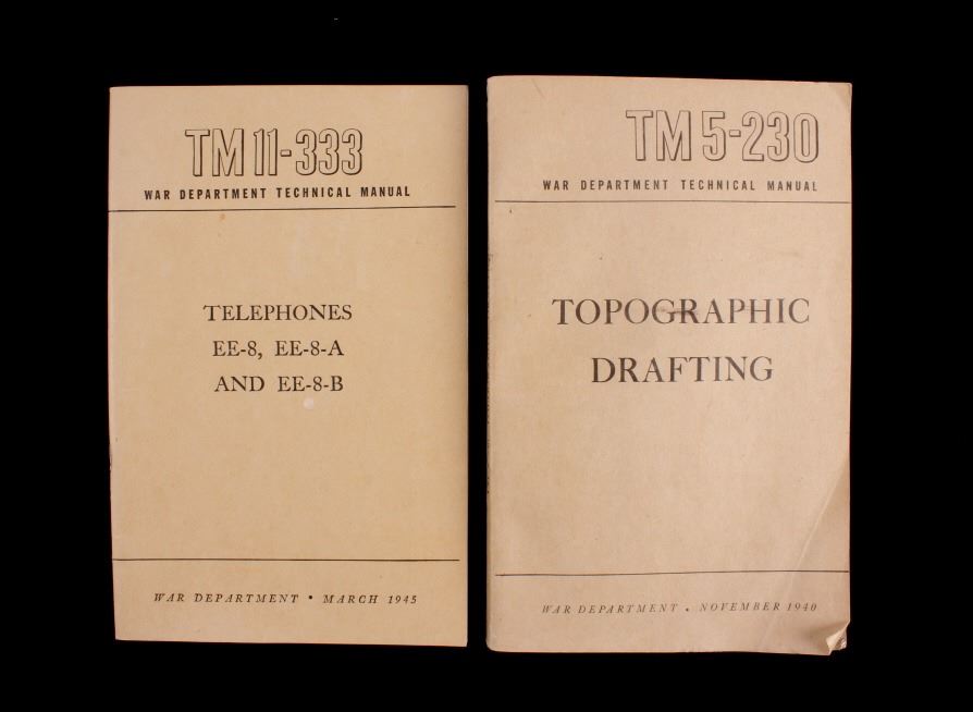 In this lot are two technical manuals from the war department in November of 1940 and March of 1945. The first of the two technical manuals is TM 5-230. This technical manual is for topographic drafting. Topographic drafting entails making maps based on aerial surveillance. The second technical manual is TM 11-333. This TM explains telephones and how to repair and operate them. These TMs are 9 1/4" x 6" x ¼”.