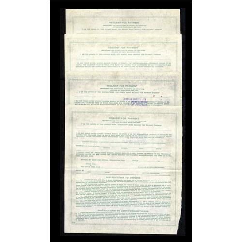 <B>War Savings $25 Bond Four Examples.</B></I><BR>A desirable fact in this 1940s - 1950s bond offering is that all of these bonds are uncancelled. This foursome is of the large format type. <B>Extremely Fine.</B></I>