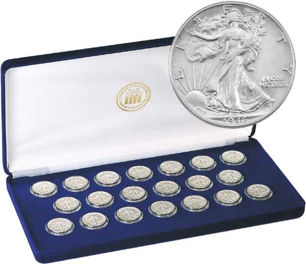 he "Walker" is widely considered to be the most beautiful .900 Fine Silver coin ever struck by the U.S. Government. The great sculptor, A.A. Weinman, showed Lady Liberty, our graceful symbol of freedom, walking toward the dawn of a new era, her hand outstretched in peace. The complete 20-coin set, in fine or better condition, includes every issue minted by the Philadelphia, San Francisco and Denver Mints from 1941 to 1947.
