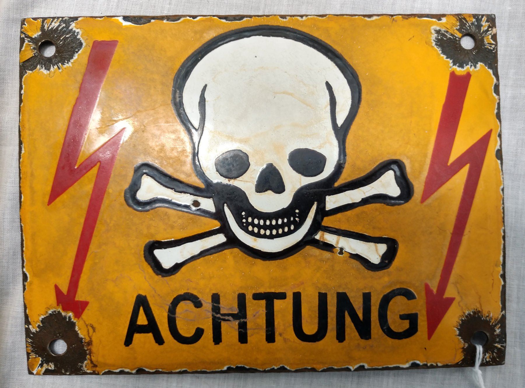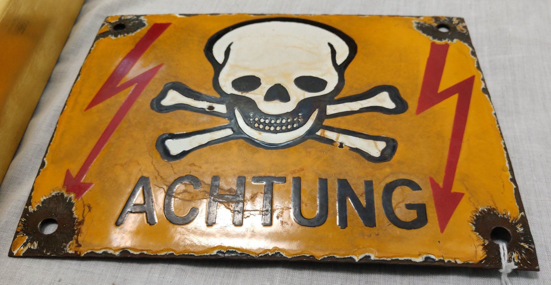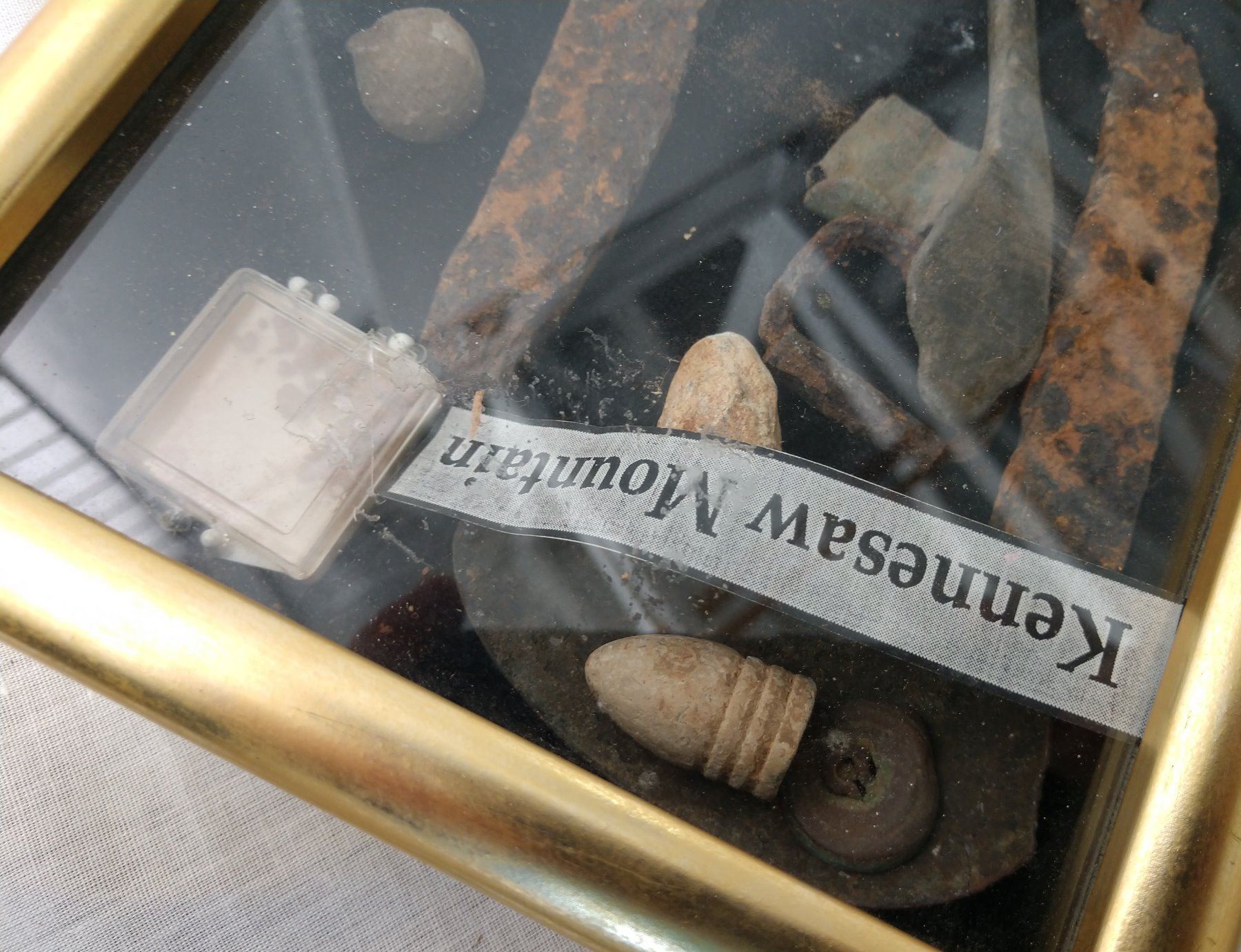 War Souvenir Collection, U.S. Civil War & WWII periods. Made of iron, steel, brass, German sign measures 8" x 6". Civil War frame measures 6" x 8". USA, Germany. One group from American Civil War, Kennesaw Mountain artifacts. 1 sign from Germany appears to be a minefield warning sign. Condition: As found, see images. Shipping: $24.50 w/insurance and signature.