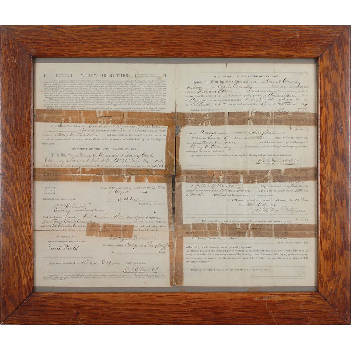 Partly-printed DS, one page, 16.5 x 13, October 15, 1864. Power of attorney document submitted to obtain a war widow’s pension. In part: “Mary A. Chaundy widow of Charles Chaundy who was a Priv. in Co. ‘B’ 96th Regt. Pa. Vols. in the service of the United States, is entitled…to receive pay at the rate of eight dollars…per month…she has not intermarried, but continues the widow of the above mentioned Charles Chaundy.” Framed to an overall size of 20.5 x 17.5. In good condition, with heavily toned tape remnants along intersecting folds (many with complete separations).