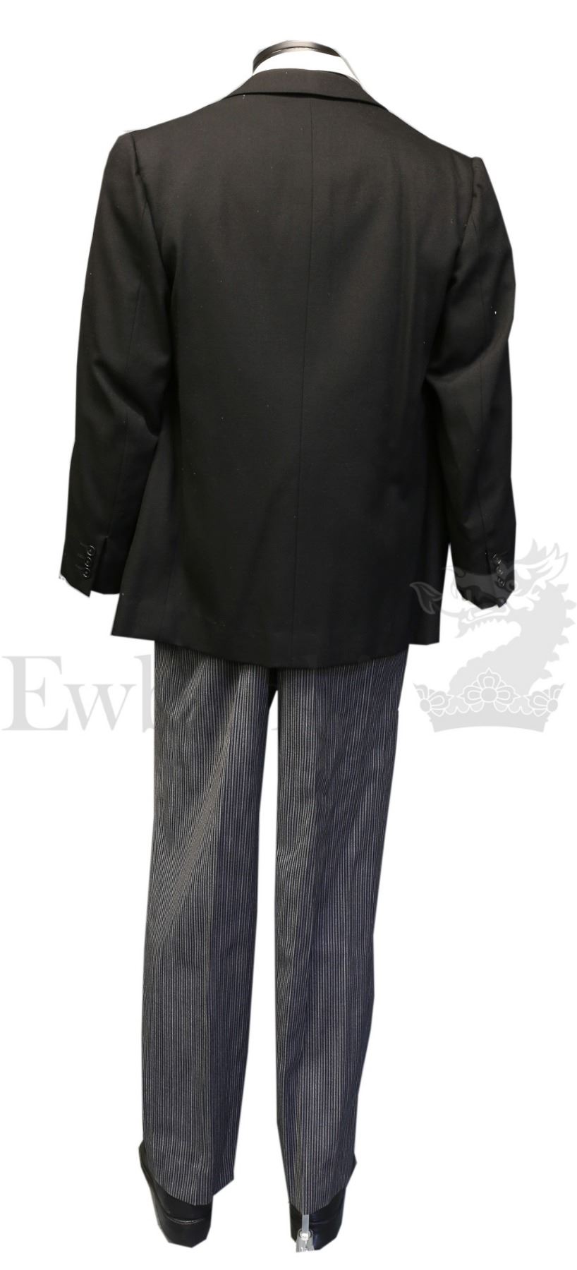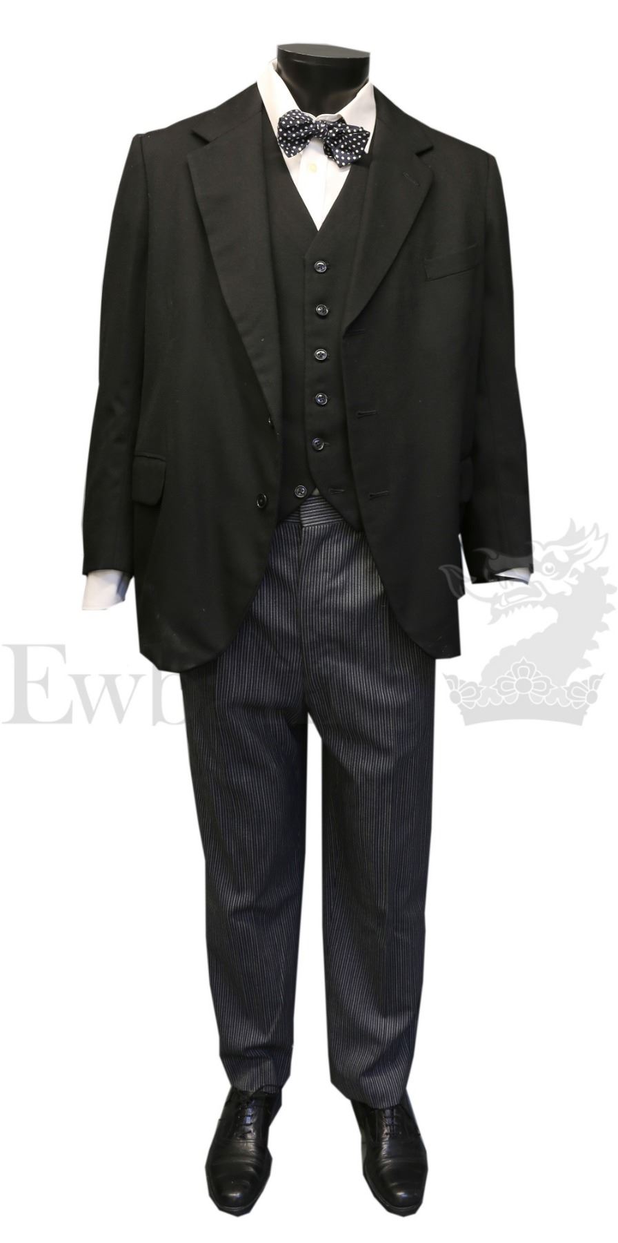 † War and Remembrance (1988) Costume worn by Robert Hardy as 'Winston Churchill'. Featured in several episodes, this is the signature costume associated with one of history's most important world leaders and is instantly identifiable as such. Comprises of a Homberg style Hat, Shirt, Waistcoat, spotted Bow Tie, Jacket, pair of Braces (suspenders), Trousers, Shoes and a body padded 'fat suit'. The costume and it's components retain their original Costumier bags (3) with the Jacket, Waistcoat, Trousers and 'fat suit' all having an internal Costumiers labels detailing the actor and year'. The Hat has 'C.B.C.' and 'Beaverbrook' hand written internally on the brim, due to alternative added subsequent production use. Please note that VAT is payable on top of the hammer price at 20% in addition to standard buyers premium inc. VAT for this lot.