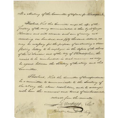 <B>War of 1812 Autograph Collection.</B></I> Often called our Second War of Independence, the importance of the War of 1812 is sometimes overlooked. Though ending in a stalemate, it once and for all confirmed America's independence from Britain as well as Canada's right to exist as a British colony in North America. This amazing group of more than 100 signed items would form the basis for, or be a welcome addition to, a fine collection of this period's military and political figures. A few of the pieces included are described below: <BR><BR>William Bainbridge, U.S. Navy Commodore famous for his victory over HMS <I>Java.</B></I> ALS with vintage steel engraving. <BR><BR>J. Newman, Commander of Fort Pike in Louisiana. February 1, 1815 LS to British officer in the Rigolets, in part: "<I>Your having passed the limits prescribed for Flags of truce, this morning placed me under the disagreeable necessity of opening my batteries on your boat carrying a Flag of truce...</B></I>" <BR><BR>Isaac Hull, U.S. Navy Commodore, commander of the USS <I>Constitution</B></I> ("Old Ironsides"). LS mentioning that very ship. <BR><BR>James Van Cleve, ALS to historian Benson Lossing with a hand-drawn pencil sketch of the Battle of French Creek. <BR><BR>David Porter, U.S. Navy officer, commander of the USS <I>Essex.</B></I> ALS and DS (twice). <BR><BR>Alexander Macomb Jr., General and hero at the Battle of Plattsburg. Long ALS. <BR><BR>Defense of Philadelphia. Important DS dated November 18, 1814, in part: "...Resolved, That this committee accept the offer of the Secretary of the navy... and will advance such sum of money not exceeding one hundred and fifty thousand dollars, as may be necessary for the purpose of constructing a steam floating battery to be employed in the defense of the shores of the Delaware and the City of Philadelphia..." <BR><BR>A fabulous collection that took years to assemble. Generally very good to fine condition. From the Henry E. Luhrs Collection. Accompanied by LOA from PSA/DNA.