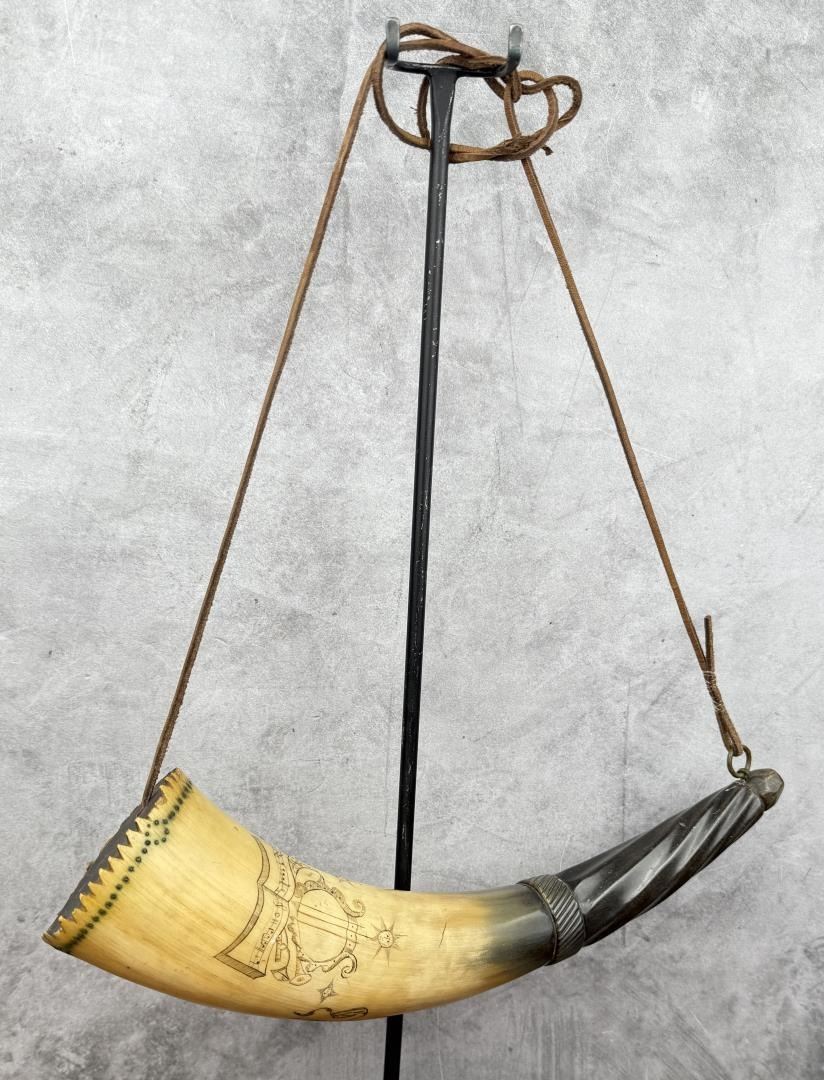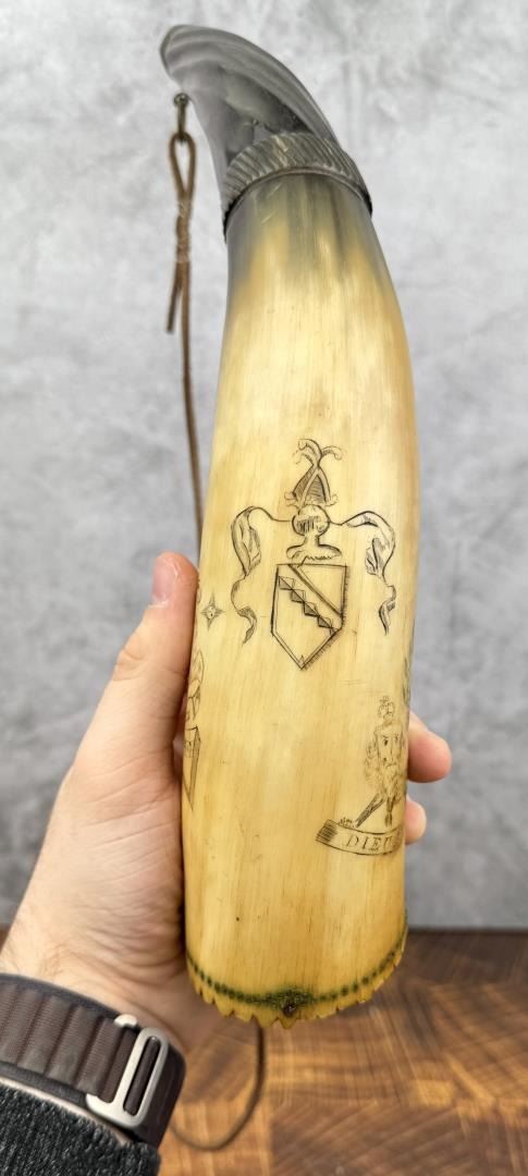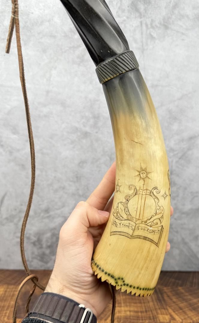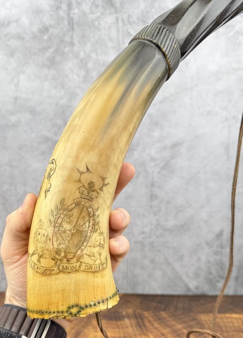 British Coat of Arms, Harp with sheet music, Heraldic Coat of Arms. Tacking along bottom edge. Twisted carving near tip as shown. Very nice example. 14" long.