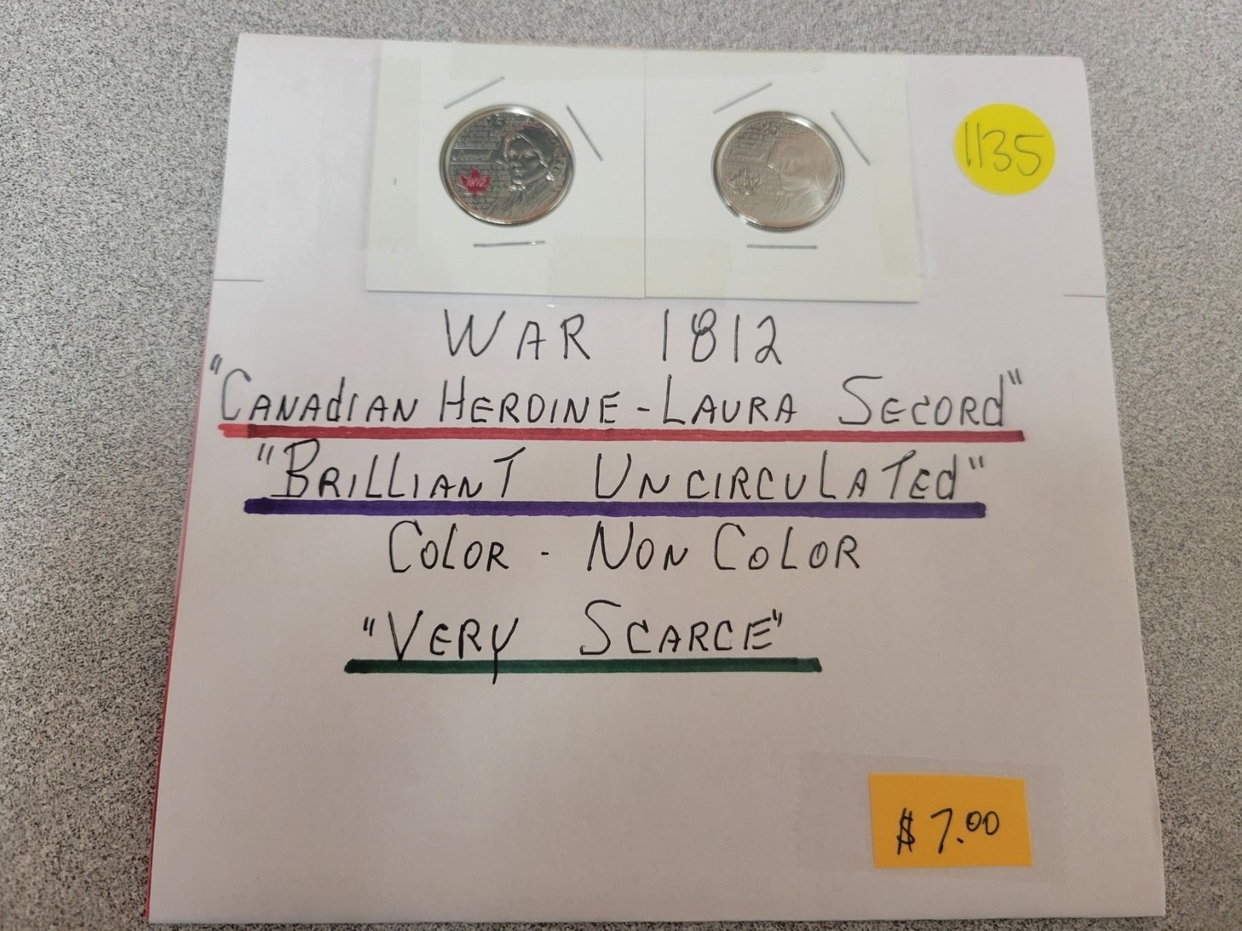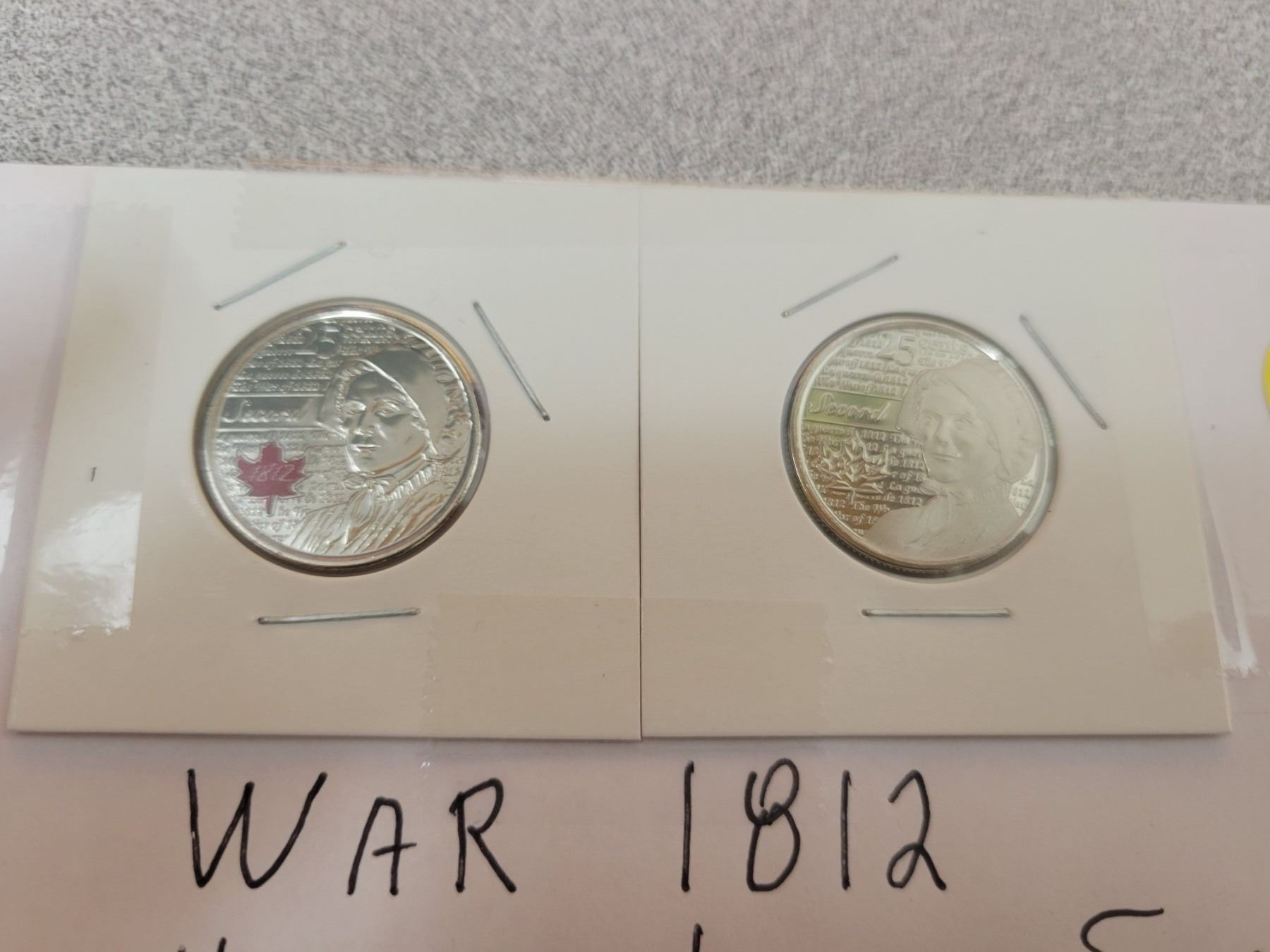 War of 1812 'Canadian heroine Laura Secord' 25¢ coins, color and non color