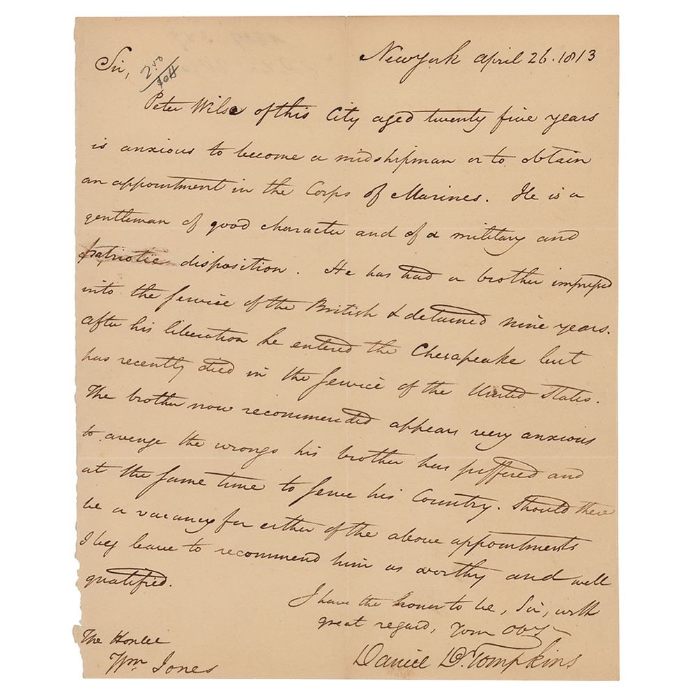 The sixth vice president of the United States under James Madison, who also served as the fourth governor of New York (1774–1825). ALS signed “Daniel D. Tompkins,†one page, 7.75 x 9.5, April 26, 1813. Handwritten letter to the Secretary of the Navy William Jones, in part: "Peter Wise of this City aged twenty five years is anxious to become a midshipman or to obtain an appointment in the Corps of Marines He is a gentleman of good character and of a military and patriotic disposition. He has had a brother impressed into the service of the British & detained nine years. After his liberation he entered the Chesapeake but has recently died in the service of the United States. The brother now recommended appears very anxious to avenge the wrongs his brother has suffered and at the same time to serve his Country. Should there be a vacancy for either of the above appointments I beg leave to recommend him as worthy and well qualified." In fine condition.