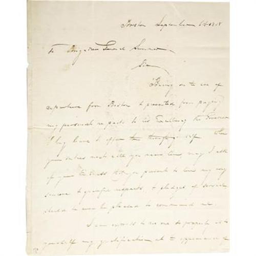 <B>War of 1812 General Jacob Brown ALS,</B></I> "<I>Jac Brown</B></I>", two pages, 8" x 10", September 6, 1808, Boston, Massachusetts, to Brigadier General Sumner, n. p. Brown, upon leaving Boston, sends the Governor of Massachusetts his respects via Sumner and compliments the latter on the deportment of his troops. Fine condition. Jacob Brown (1775-1828) of New York became a Brigadier General of state militia in 1809 and commanded to northern frontier of New York during the War of 1812. <I>From the collection of Henry E. Luhrs.</B></I><BR><BR><b>Shipping:</b> Flat Material, Small (<a target="_blank" href="http://www.heritageauctions.com/common/shipping.php">view shipping information</a>)