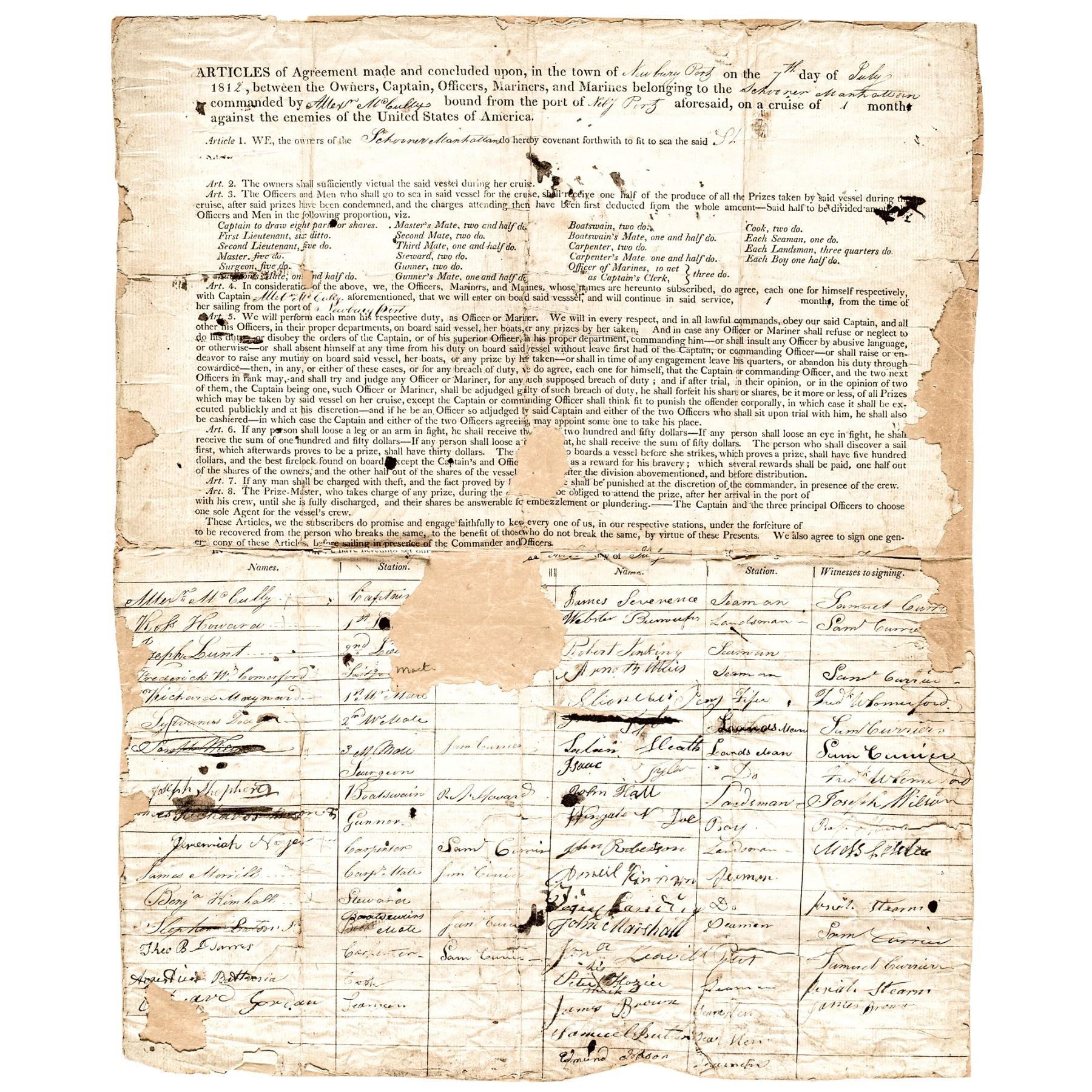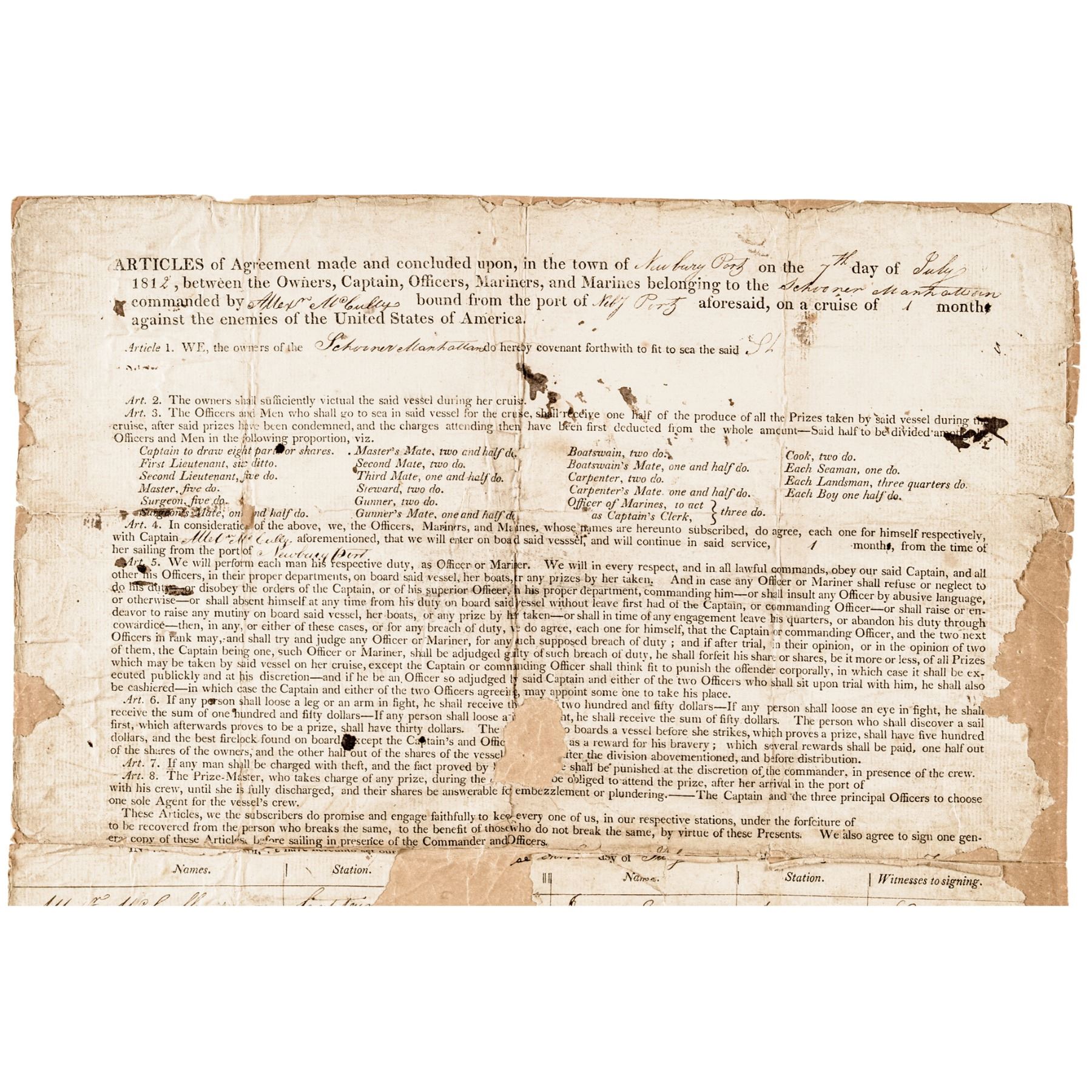 On June 18th, 1812 the United States officially declared a state of War on Great Britain. On June 26th, 1812, a week after Congress voted for War, it passed a bill allowing Privateers, which President James Madison signed into law the next day on June 27th. Offered is an exceptionally important American War of 1812 Naval Warfare Document signed just 10 Days Later on July 7th, hardly enough time to typeset and print this Agreement since the Privateers Act was authorized as law in the United States. This official printed and acknowledged Articles of Agreement between the town of Newburyport (MA), and the Captain and Crew of the “Schooner Manhattan” whose purpose was to sail from Newburyport, “... on a cruise of 1 month against the enemies of the United States of America.”