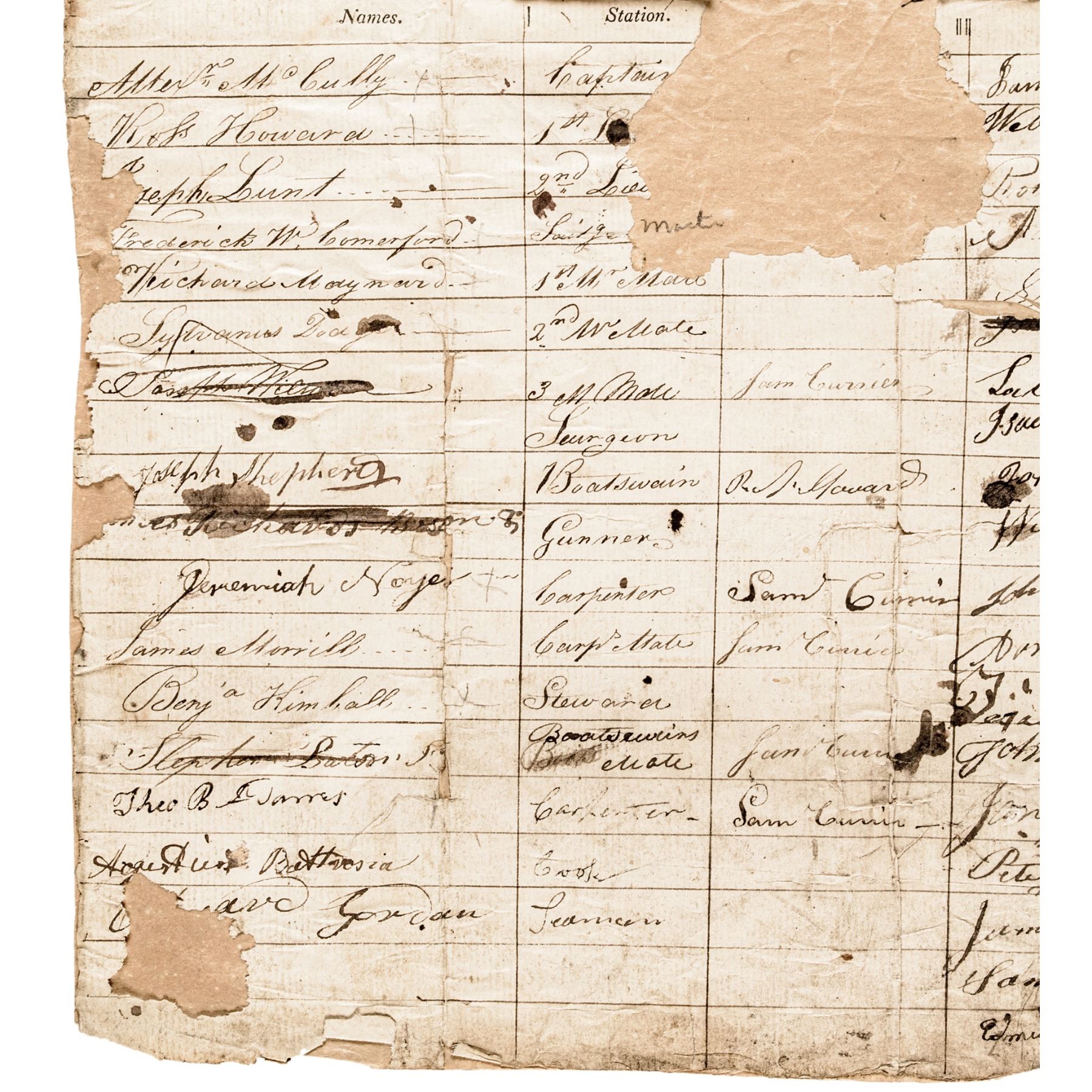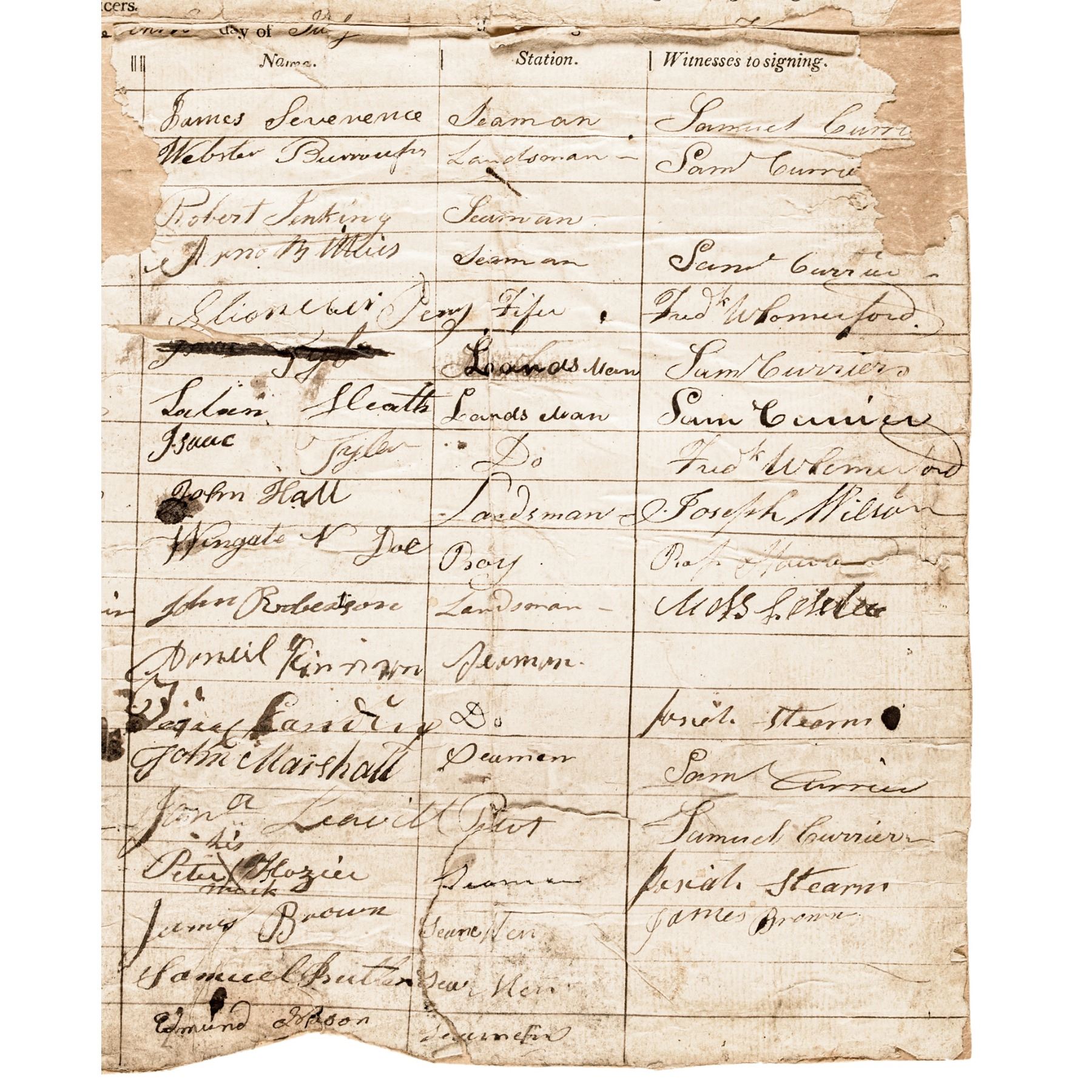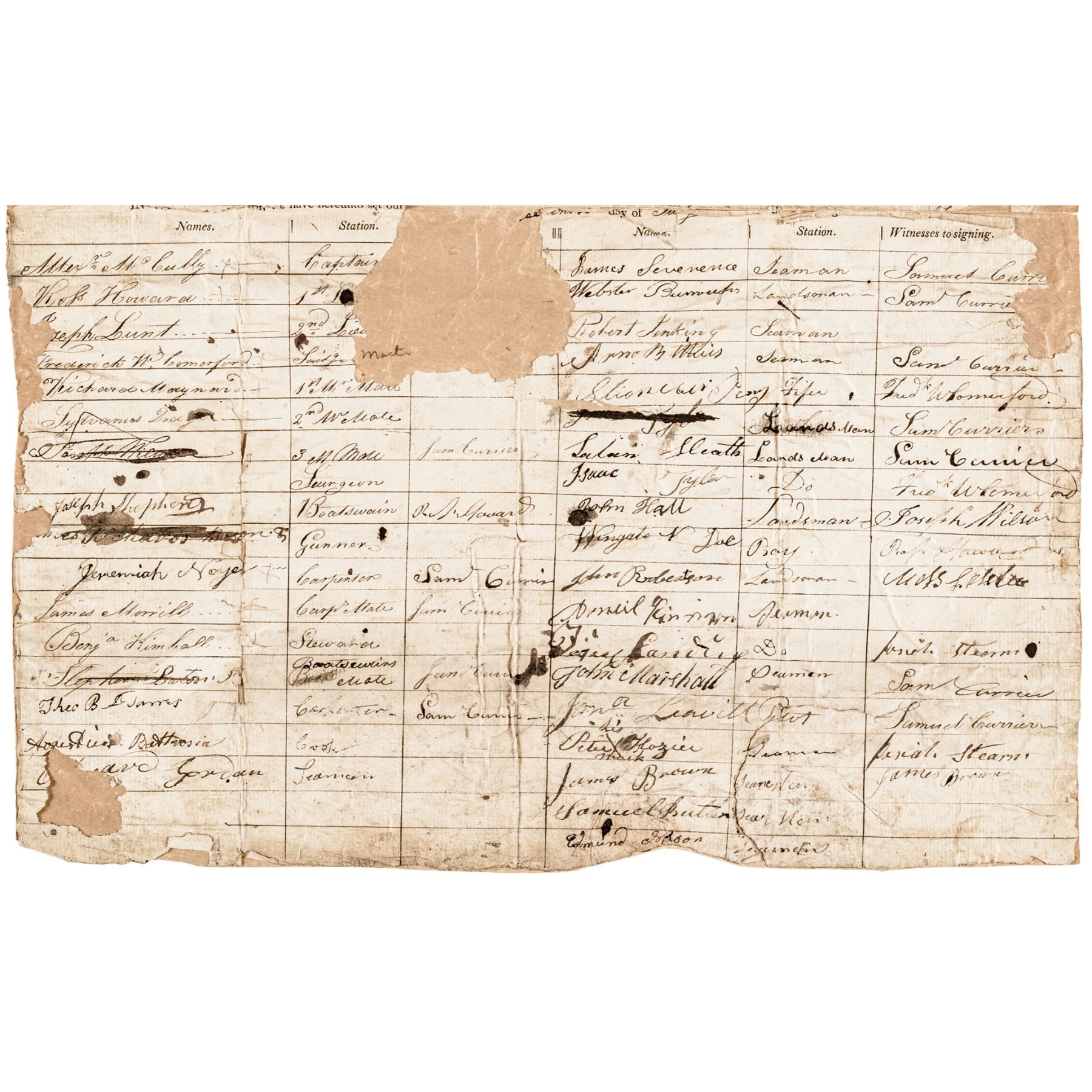 Ominously, its Article 6 addresses what would happen if a crew member was injured stating: “If any person should lose a leg or arm in fight, he shall receive the sum of two hundred and fifty dollars -- If any person shall loose (sic) an eye in fight, he shall receive the sum of one hundred and fifty dollars” and so on. The lower half of this Document includes the actual Handwritten inked signatures for the crew of 31 men and witness to their signing (though some names have been struck through), some having condition issues in readability. Signers each record their rank and job title, including the Captain, the officers, and the seamen. Some paper loss affects a portion of seven lines of the agreement where lacking near center, at some of the witness signatures, and irregular roughness lacking some of the outer borders. Nonetheless, this is an incredible record of the hiring of an actual Privateer, thus its rarity exceeds its condition.
