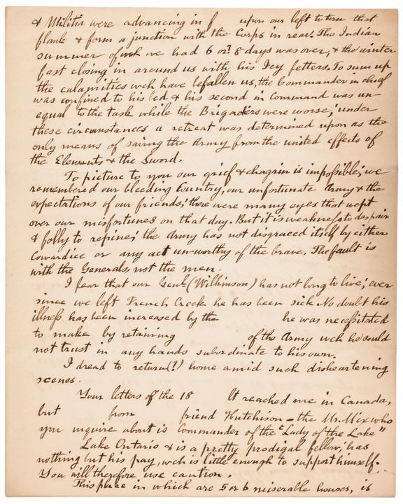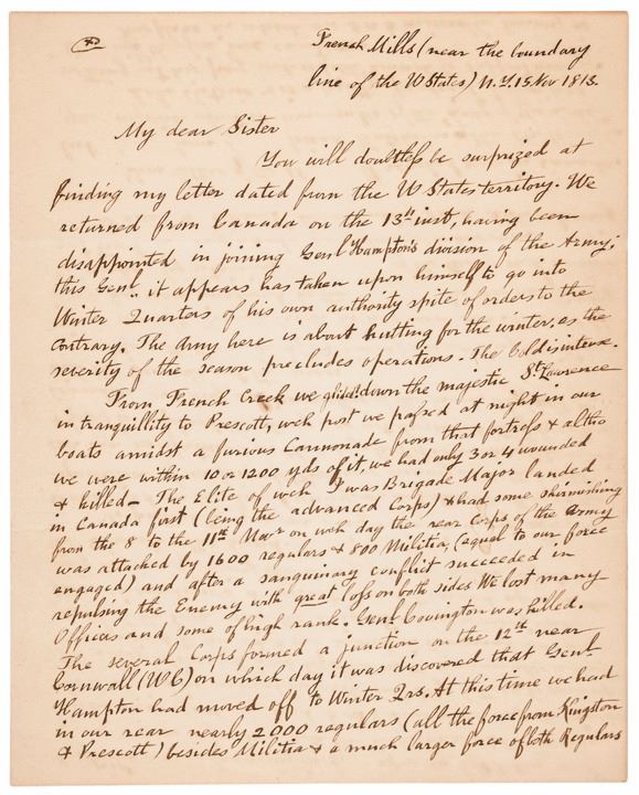 “...We returned from Canada...having been disappointed in joining Genl. Hampton’s division of the Army. This Genl. it appears has taken upon himself to go into Winter Quarters of his own authority spite of orders to the contrary. The army here is about hutting for the winter...From French Creek we glided down the majestic St. Lawrence in tranquility to Prescott, which post we passed at night in our boats amidst a furious cannonade from that fortress & altho we were within 10 or 1200 yds of it, we had only 3 or 4 wounded & killed. The Elite of which I was Brigade Major landed in Canada first (Being the advanced corps) & had some skirmishing from the 8 to the 11th Novr. on which day the rear corps of the Army was attacked by 1600 regulars & 800 militia (equal to our force engaged) and after a sanquinary conflict succeeded in repulsing the enemy with great loss on both sides. We lost many officers and some of high rank. Genl. Covington was killed. ...To picture to you our grief & chagrin is impossible, we remembered our bleeding country, our unfortunate army & the expectations of our friends! There were many eyes that wept over our misfortunes on that day...”.