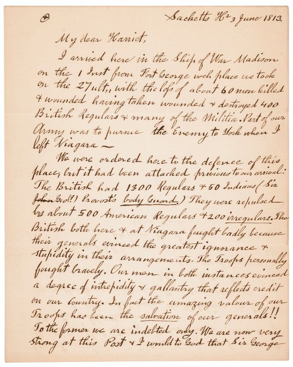 “...I arrived here in the Ship of War Madison on the 1st Inst from Fort George which place we took on the 27 ult. with the loss of about 60 men killed & wounded having taken wounded & destroyed 400 British Regulars & many of the militia. Part of our Army was to pursue the enemy to York when I left Niagara. We were ordered here to the defence of this place, but it had been attacked previous to our arrival. The British had 1300 Regulars & 50 Indians (Sir. Geo. Prevost’s Body Guard) They were repulsed by about 500 American Regulars & 200 irregulars. The British both here & at Niagara fought badly because their generals evinced the greatest ignorance & stupidity in their arrangements. The troops personally fought very bravely. Our men in both instances evinced a degree of intrepidity & gallantry that reflects credit on our country. In fact the amazing valour of our Troops has been the salvation of our generals!!. To the former we are indebted only...”.