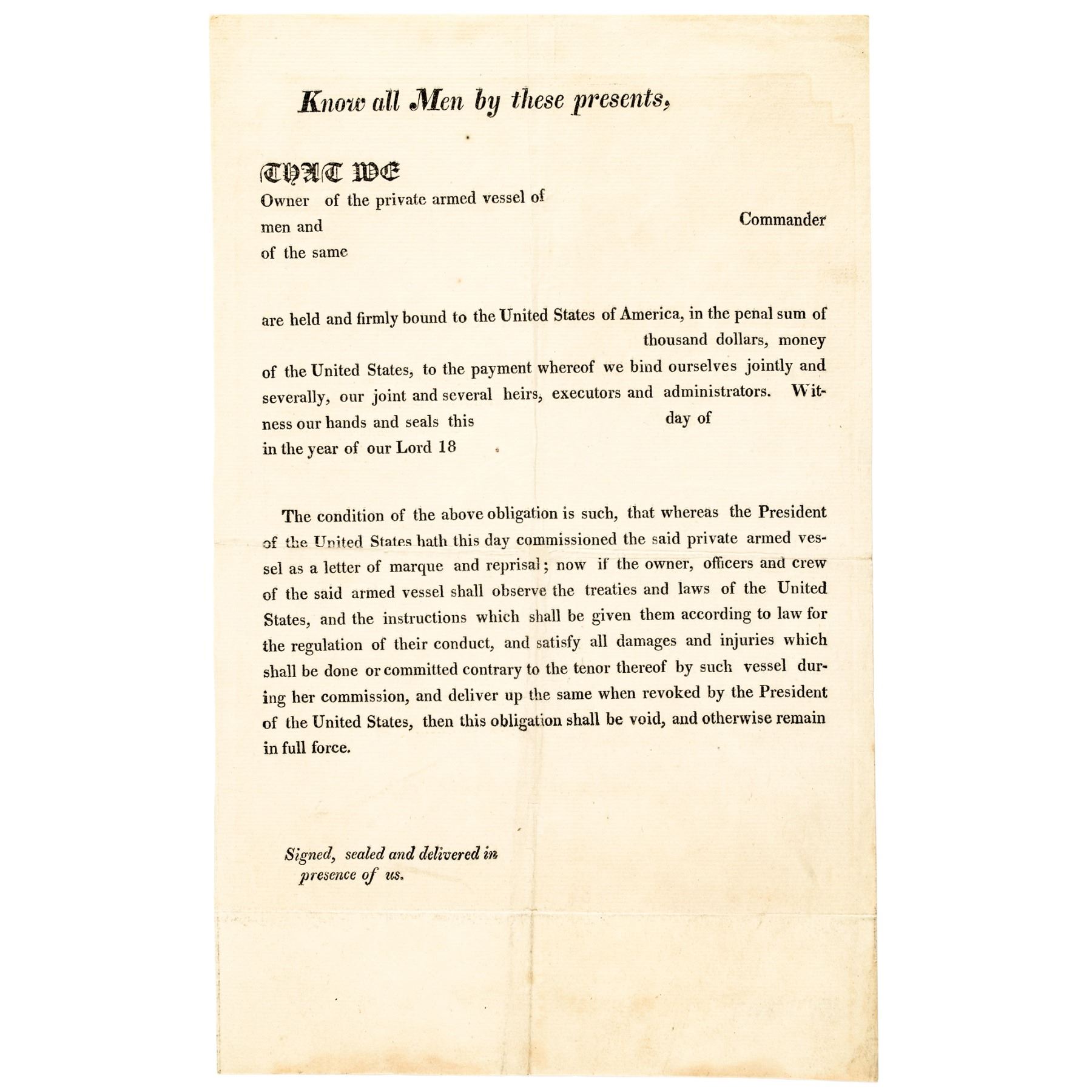“Know all Men by these presents, - THAT WE ________ Owner(s)__ of the private armed vessel of ________ men and ________Commander of the same ______________________ are held and firmly bound to the United States of America, in the penal sum of ____________ thousand dollars, money of the United States, to the payment whereof we bind ourselves jointly and severally, our joint and several heirs, executors and administrators, Wit-ness our hands and seals this _________ day of _________ in the year of our Lord 18___.