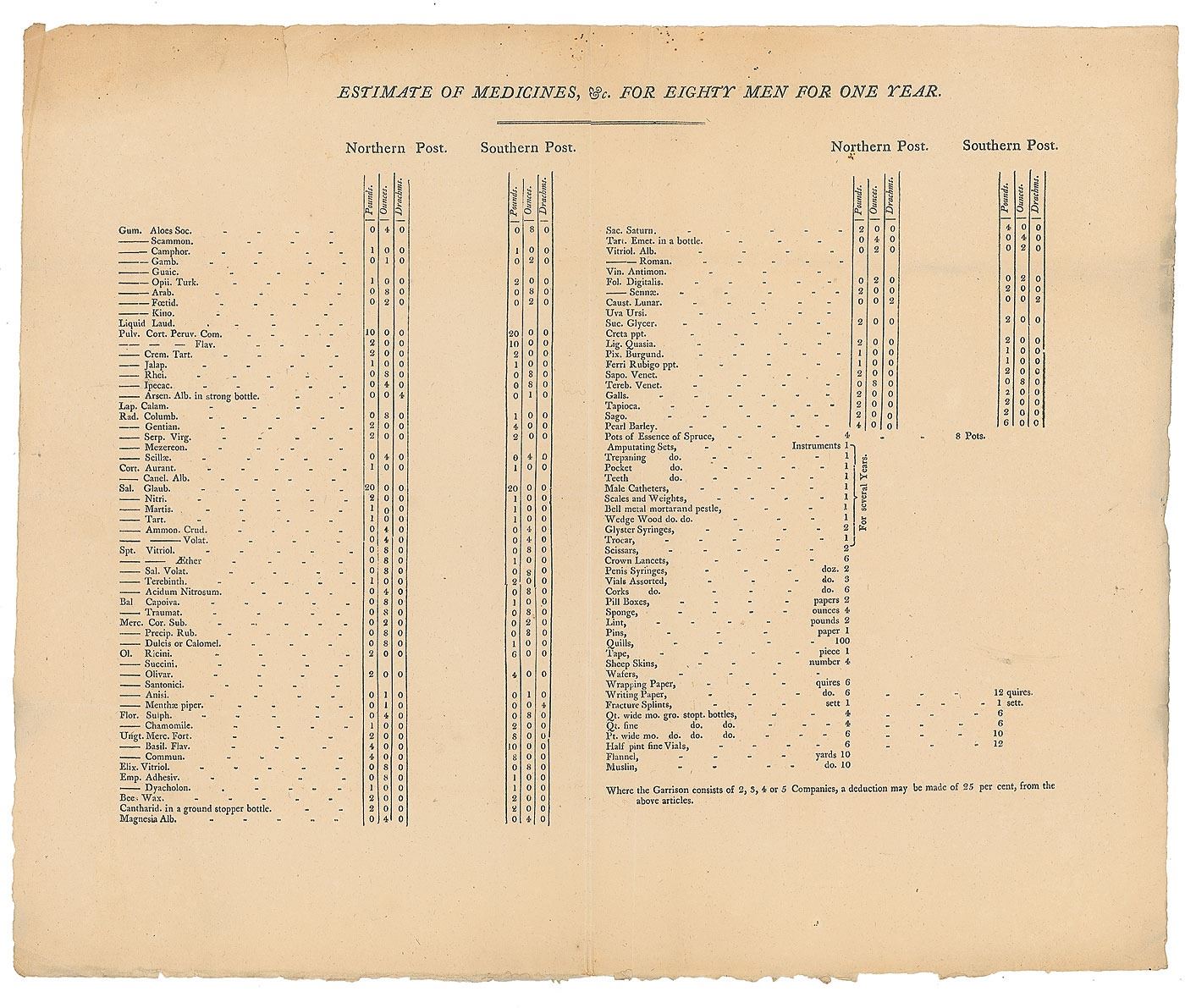 Scarce medical supply broadside headed "Estimate of Medicines, &c. for Eighty Men for One Year," one page, 16 x 13.5, no date but circa 1811. An inventory of medicines and instruments necessary for a military surgeon. The list includes two sets of amounts, one for a "Northern Post" the other for "Southern Post" with the necessary variations for the differing climates. Items listed include trepanning equipment (used to drill holes in the skull), amputating sets, camphor, and opium. In fine condition, with a central vertical fold, and a crease and tear to the top edge.