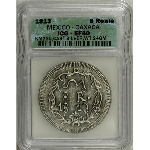 <B>War of Independence, Oaxaca 8 Reales 1813,</B></I> KM-235, cast silver from the South (SUD) of Mexico under General Morelos, with his monogram on reverse, XF40 ICG, a choice piece with a dramatic eye-appeal for this issue, with huge denticles on both sides, perfect centering, essentially an ideal strike with incredible details, and two-tone silver-gray surfaces.<BR><BR><b>Shipping:</b> Coin/Currency (<a target="_blank" href="http://www.heritageauctions.com/common/shipping.php">view shipping information</a>)