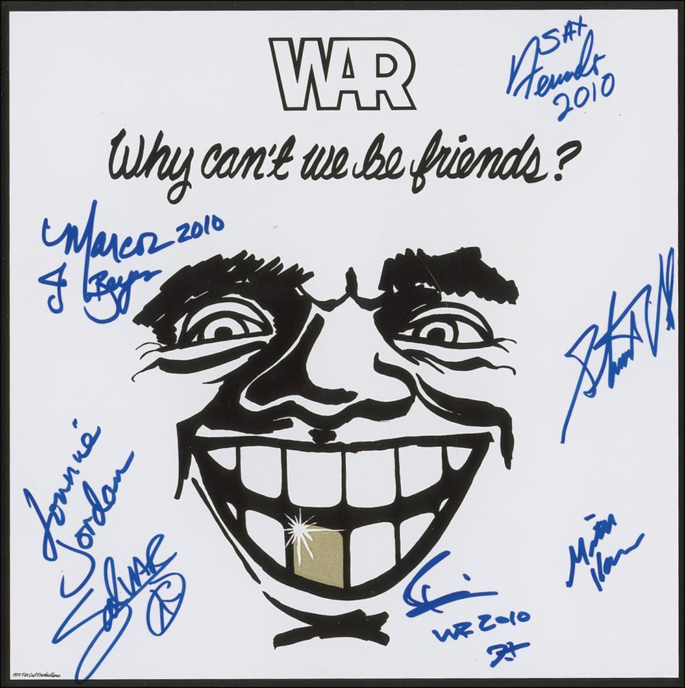 Color glossy 12 x 12 photo of the album, Why Can’t We Be Friends?, signed in blue felt tip by Lonnie Jordan, Fernando Harkles, Marcos Reyes, Stuart Ziff, Sal Rodriguez, Pancho Tomaselli, and Mitch Kashmar. In very fine condition.
