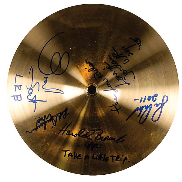 Gold 8” cymbal, signed on the top in blue felt tip by original band members Lee Oscar, Lonnie Jordan adding "The Low Rider," Harold Ray Brown adding "Take a Little Trip," Morris ‘B.B.’ Dickerson and Howard E. Scott. In fine condition.