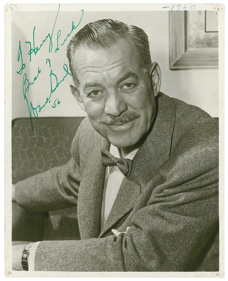 Vintage matte-finish 8 x 10 photo, signed and inscribed in green fountain pen “To Harry, Best of luck, Ward Bond ‘56.” The reverse bears several “Wilkinson Collection” ink stamps. In very good condition, with tack holes to corner tips, diagonal crease through image, and ballpoint notation to top border.