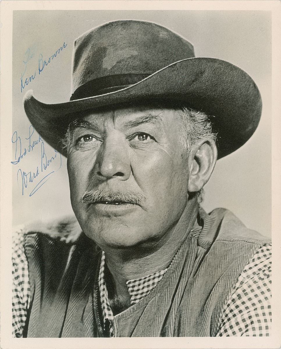 Character actor (1903–1960) remembered for his roles in Wagon Train, It’s a Wonderful Life, and The Searchers. Vintage matte-finish 8 x 10 photo of Bond in the classic Wagon Train television series, signed and inscribed in blue ballpoint, “To Ken Browne, Good Luck, Ward Bond.” In fine condition, with fading to the top of the inscription.