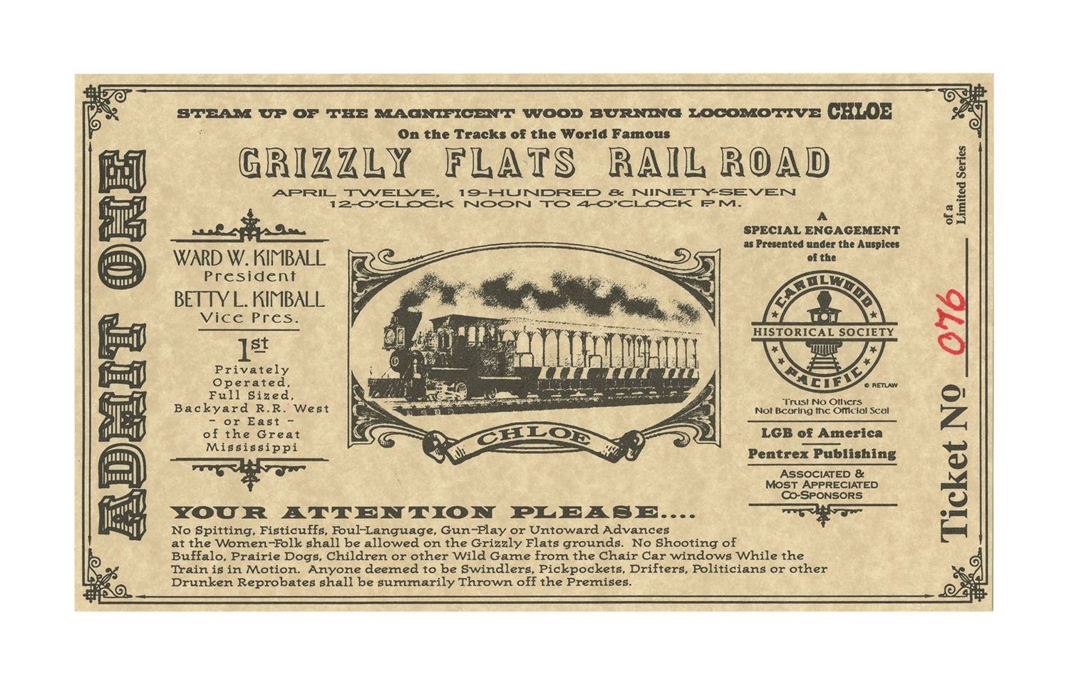 (Kimball, 1997) An extremely rare, hand-numbered ticket for the April 12, 1997 Steam Up of the locomotive Chloe on the Grizzly Flats Railroad, the backyard railroad of legendary Disney animator Ward Kimball. Operated from 1946-2006, the Grizzly Flats was the first such personal railroad in the United States. It served as direct inspiration for Walt Disney’s own Carolwood Pacific Railroad and ultimately influenced the design of the Disneyland Railroad. The code of conduct enumerated on the ticket includes, “No Spitting, Fisticuffs, Foul-Language, Gun-Play or Untoward Advances at the Women-Folk shall be allowed…No Shooting of Buffalo, Prairie Dogs, Children, or other Wild Game from the chair car window While the Train is in Motion…” The ticket is hand numbered in red felt pen, “076”. Measuring 3.5”x7”, the ticket is in very fine condition with only the faintest suggestion of wear.