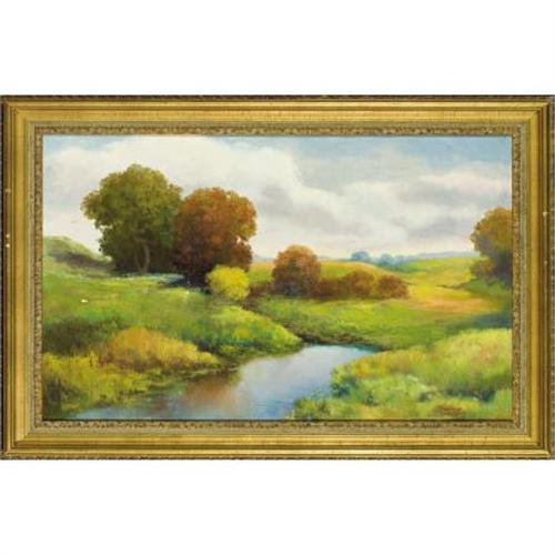 <B>WARD SHADOMY (American, 20th Century)</B></I><BR><I>Autumnal Landscape</B></I><BR>Oil on canvas<BR>24 x 36 inches (61.0 x 91.4 cm)<BR>Signed lower right: <I>Ward Shadomy</B></I><BR> <B>Condition Report:</B> Some scattered areas of inpainting, principally in the sky at the horizon; two abrasions to canvas, one approximately 1/2 inch long in upper left quadrant, the other approximately 2-1/2 inches long in upper right quadrant; minor areas of paint loss in left half; some craquelure, principally in sky and water; stretcher marks.<BR><BR><b>Shipping:</b> Framed - without Glass, Large (<a target="_blank" href="http://www.heritageauctions.com/common/shipping.php">view shipping information</a>)