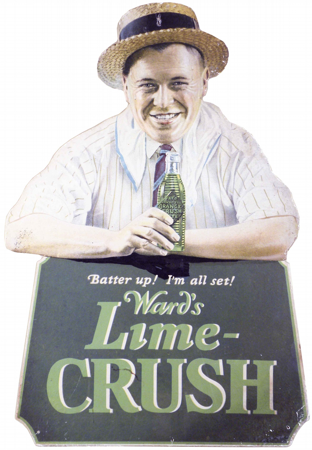 Ward's Lime Crush Die Cut Cardboard Sign. Framed under glass. Hole at 12/5:00 and paper loss at left elbow otherwise fair condition.