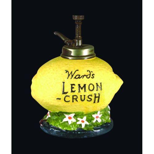 Wards Lemon Crush Syrup Dispenser with original lemon button pump. Minor paint chips at base, no cracks. 13 inches tall.