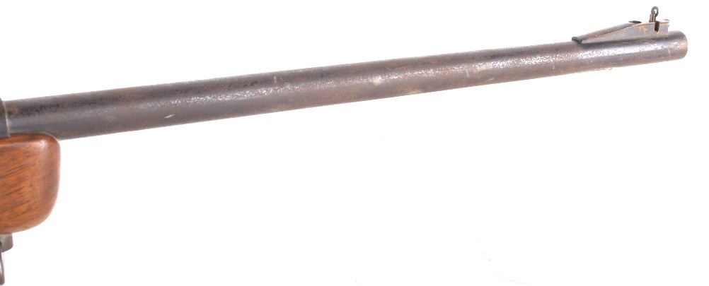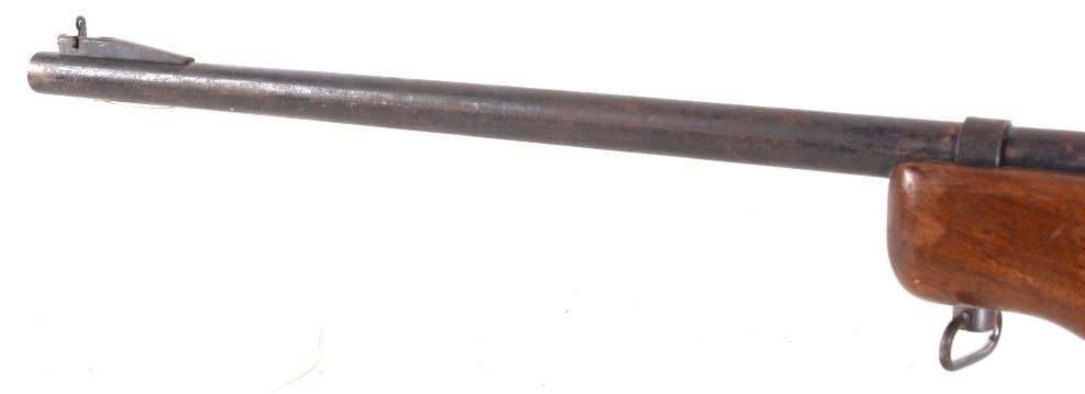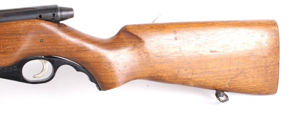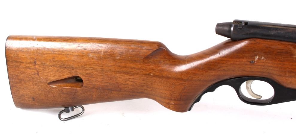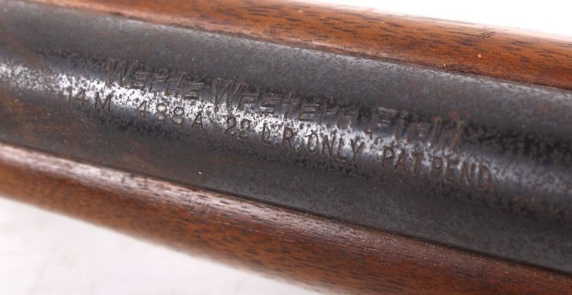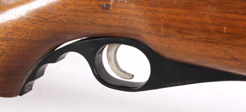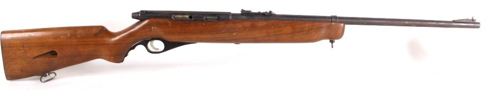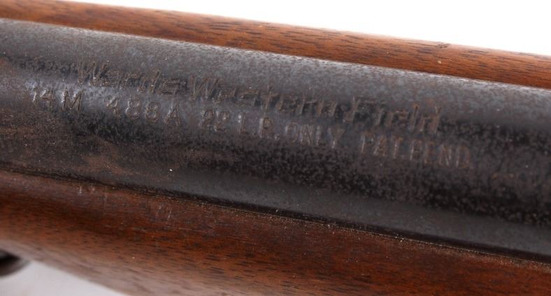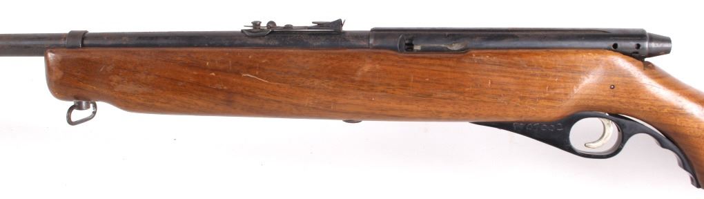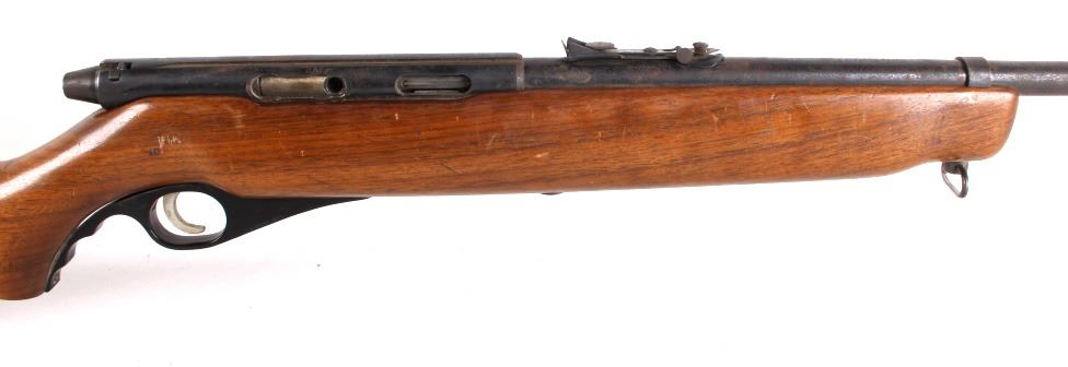 This lot features a Wards Western Field 22LR semiauto rifle from 1939-42. The Western Field Model 14M 488A is a variant of the Mossberg Model 50. The rifle is features a tube magazine in the stock and adjustable sights. It is is in fair condition for its age. It looks to be missing the bolt handle, but is in otherwise complete shape. The barrel measures 23" L and the overall length is 43 1/4" The serial number is P707002