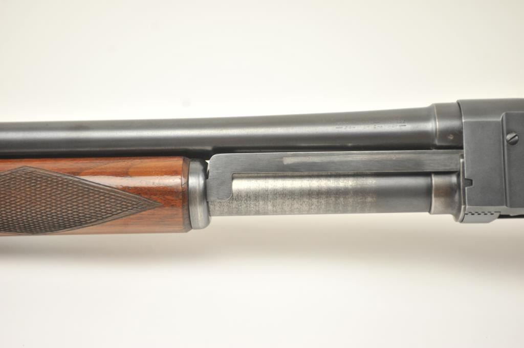 Wards Western Field Model 30 pump shotgun, 12 gauge, Serial #SB562A. The shotgun is in very good to fine overall condition with a 30” barrel. The metal surfaces retain the majority of the muted blue finish with wearat the muzzle and handling marks. The checkered wood stock is in good condition with mars and scratches consistent with field use. The butt stock ends with a ventilated rubber recoil pad providing a 14 ½” LOP. The bore is good and the action works well. Est.: $200-$400.