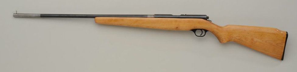 Wards Western field 410gauge bolt action shotgun with 3 inch chamber in good used condition. The gun shows a 24 inch barrel with replaced high front sight and finish has been deliberately removed from forward 5inches of barrel and 1 inch of breach. The stock has been lightly refinished and the action is not cocking. The bore is good. Est. $40-$80