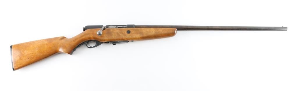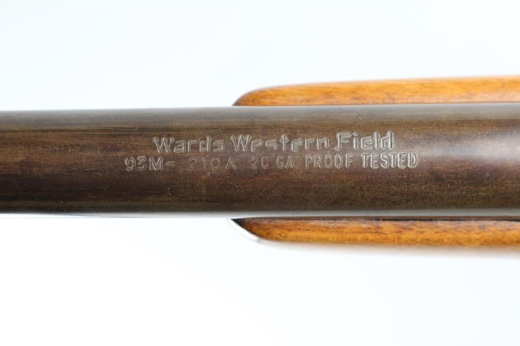 This is a Mossberg Model 85 made for Montgomery Ward between 1940 and 1947.Bolt action shotgun, 26" round barrel, screw is present, but no sighting bead. Detachable box magazine, serrated trigger, smooth walnut stock with black plastic buttplate. Bore appears excellent, action is smooth, wood is very good with minor scratches. Blue finish has turned to a mixture of blue/plum color. Plastic triggerguard is damaged and is cracked. NRA Condition-Good/Damaged Triggerguard. C&R Firearm.