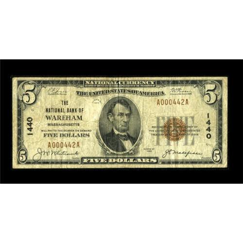 <B>Wareham, MA</B></I> - $5 1929 Ty. 1 <B>The NB of Wareham</B></I> Ch. # 1440<BR> A tougher Plymouth County bank which is seldom available. Evenly circulated <B>About Fine, </B></I>problem free for the grade. <BR><BR><b>Shipping:</b> Coins & Currency (<a target="_blank" href="http://www.heritageauctions.com/common/shipping.php">view shipping information</a>)
