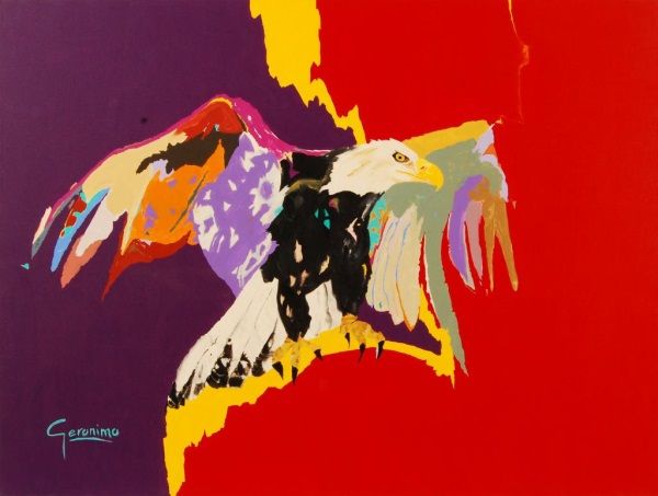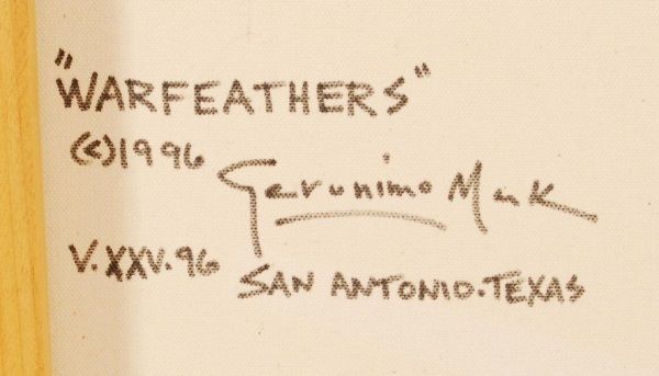 Signed Geronimo, San Antonio, Texas. 48" x 36". Artist Geronimo Mark exhibited his bold, large acrylic works at Indian Market, Santa Fe 1994, and has had sell-outs of his paintings in his several one-man shows at galleries in Santa Fe, Scottsdale, New York City, Washington D.C., Chicago and San Antonio. His paintings are in private collections in Texas and throughout the United States and has had feature editorial articles on him and his paintings in Santa Fe Magazine and in the San Antonio Express News. His work has sold rapidly at several San Antonio KLRN benefit auctions.