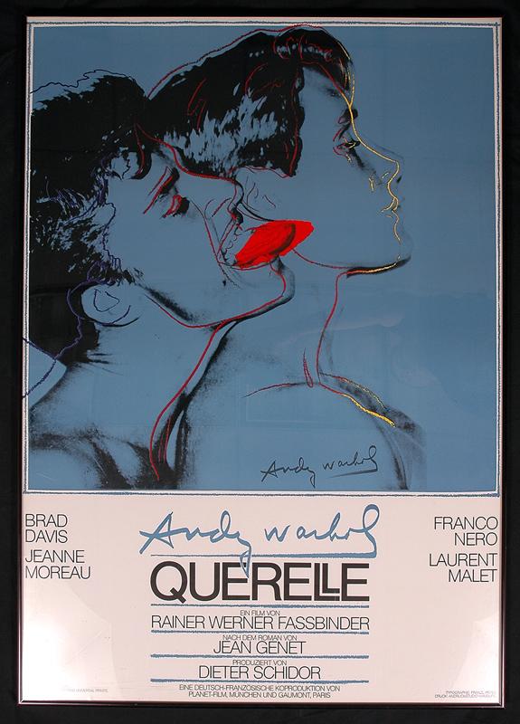 Warhol, Andy. Querelle (blue). Poster advertising the 1982 film "Querelle," directed by Rainier Werner Fassbinder and starring Brad Davis and Jeanne Moreau. The design, however, is a homoerotic one made by Warhol for a series of paintings called "Sex Parts": two men face right; the one behind is about to thrust his blood-red tongue into the other's ear. The background and the men are electric blue, with profile and features outlined in red and yellow. Signed twice in the plate. 39½ x 27½". Framed to 39½ x 27¾". Excellent condition.