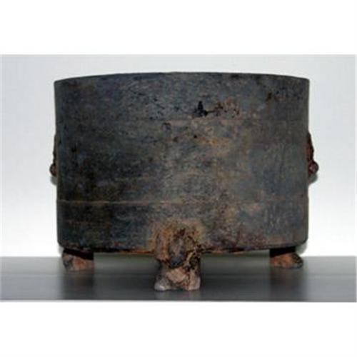 Exceptional quality,most impressive and very beautiful. Waring States Cacepot with three legs, crest on two sides, gery in color, 13 3/4" diameter x 13 3/4" high.
