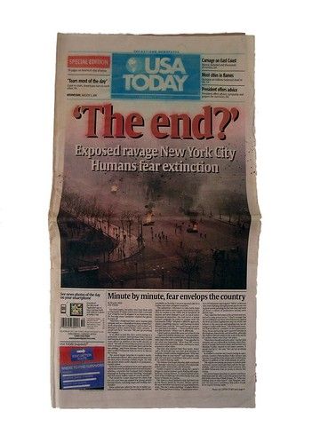 The future doesn't look so good in "Warm Bodies" (2013), especially since it is populated with a horde of the Undead! This is a screen used, hero, 'USA Today' newspaper with the headline 'The End?'. Distressed on the front with a real newspaper under.