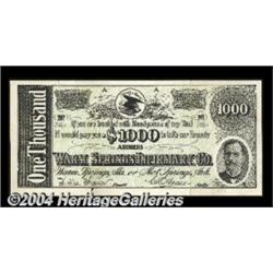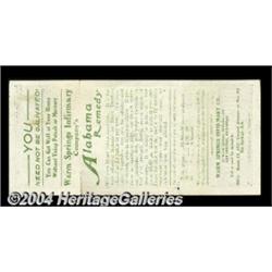 Warm Springs, AL - Warm Springs Infirmary Co. $1,000 Advertising NoteThis ad note, advertising this company's "Alabama Remedy," was issued from their Alabama and Hot Springs, Arkansas locations. Very Fine overall, with a couple of edge splits at the folds. <BR><BR><B>Important notice:</B> Heritage usually auctions material at the rate of 200-250 lots per hour. On some occasions eBay Live bid software or the Internet may not be able to keep up with the pace of the auction. We recommend placing a realistic absentee bid now as insurance to avoid disappointment. Occasionally the auctioneer may eliminate or reject an eBay Live bid, and the auctioneer may also reopen a lot after the close of the eBay live bidding (usually because we missed an audience bid), and may reject your bid even if it shows you as the winning bidder. By bidding via eBay Live, you agree that Heritage may award the lot to another bidder at its sole discretion under the circumstances described above or any other reasonable circumstances. Since eBay bids are not shown to us until we open the lot on the floor, we treat those bids just like floor bids. In most cases the floor responds before the eBay bid is presented to us, due to Internet lag time, so for consistency we have made it a policy that floor bids are always considered first over tie eBay live bids. Also please note that all Heritage lots purchased through eBay Live carry a 20% Buyer's Premium. Please make sure you read the Terms and Conditions before you bid. <BR><BR><B>IMPORTANT ANNOUNCEMENT ABOUT RESERVES:</B> Heritage now divulges all reserves on its web site 7 days before every auction. If you want to know whether the reserve on this lot has been met, and if not, what the reserve amount is, please visit this lot page on the HeritageCoin.com web site, or email: bid@HeritageGalleries.com