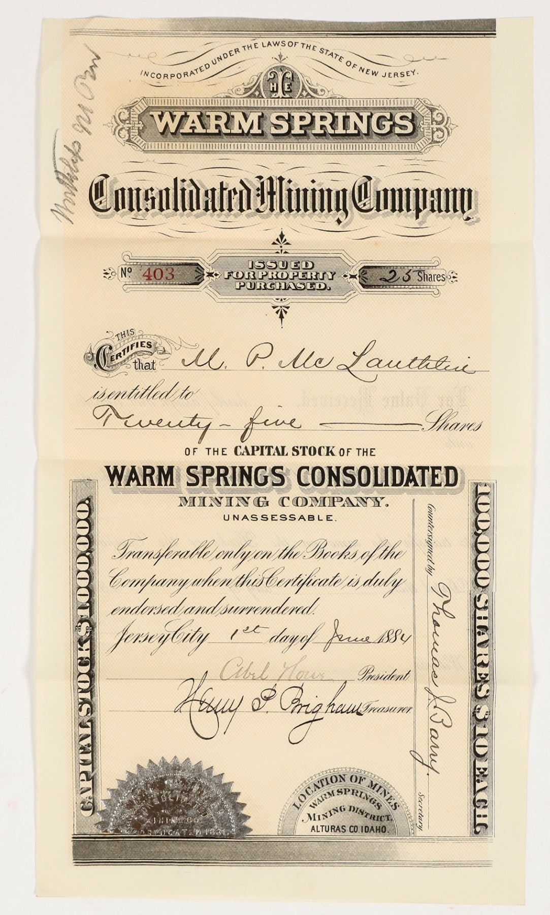 "Location of Mines Warm Springs Mining District, Alturas Co., Idaho" printed at bottom of certificate. Inc. in New Jersey. No. 403, issued for 25 shares to MP McLauthlin in 1884. Signed by president Abel Howe and treasurer Brigham. Not cancelled. Unusual vertical format. Folds, 10.5 x 6" A Sept. 1882 Ketchum Keystone article notes they are applying for a patent on the North Star Mine.
