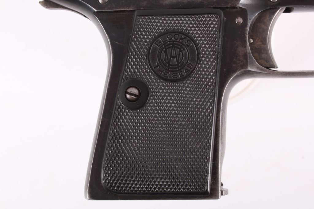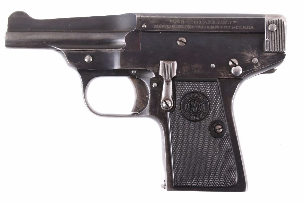 This is an excellent Warners Arms Corporation “The Infallible” model semi-automatic pistol in 32 ACP. The Warner Arms Corp was established in Brooklyn in the early 1900s to import the Schwarzlose pistol from Germany. When importation of the Schwarzlose ceased, Warner Arms began manufacturing the Infallible about 1914. In 1917 Warner merged and became Davis-Warner Arms Co. In 1919 operations ceased and pistols manufactured by Davis-Warner were called “Infallible” without “The”. Though never popular, the pistol is becoming a valued collector’s item. This is a first model pre-merger manufactured from 1914 to 1916 and has a wonderful “WAC Blocks The Sear” embossed logo. The Infallible pistol was also a American Military pre-WWI and WWI issue pistol. Unusual design by Andrew Fyrberg of Worcester, Mass., who sold his patents to the Warner Arms Corp. of New York City, NY. Marked on the side, “The Infallible Warners Arms Corporation Norwich, Ct. U.S.A”. Serial Number of 6709. This has a 3 ¼ inch solid rib barrel. Curio & Relic requires FFL Transfer or NICS Background.