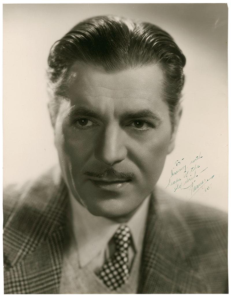 Handsome vintage glossy 10.25 x 13.5 20th Century Fox head-and-shoulders publicity photo, credited to Gene Kornman, signed and inscribed in green fountain pen “To Jimmy with heaps of the old wish.–Warner 1937.” In very good condition, with lightly trimmed edges, scattered creases, and signature and inscription several shades light, but completely legible.