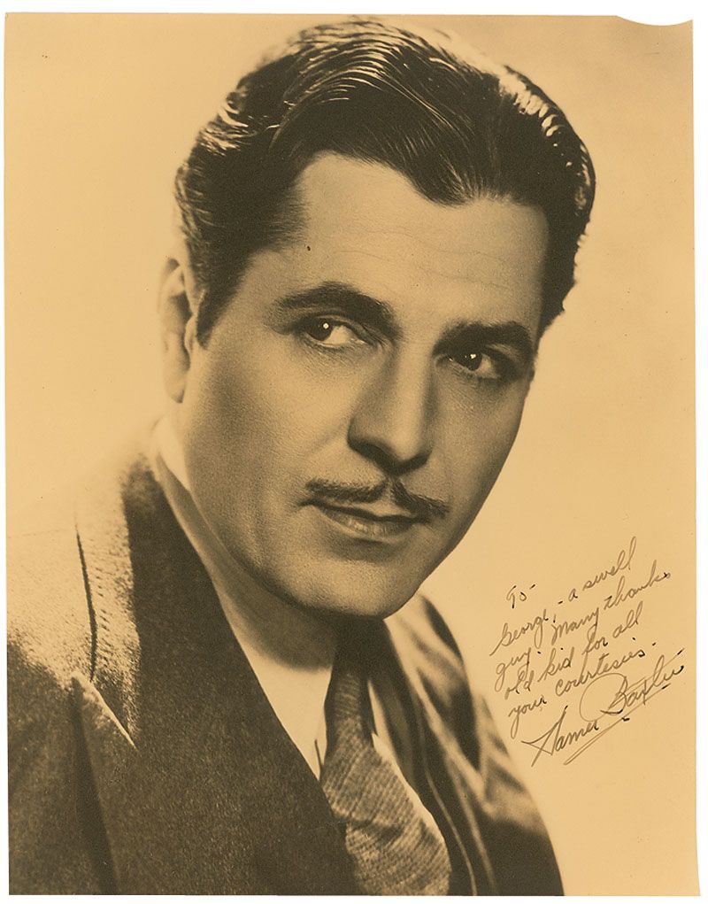 Vintage sepia matte-finish 10.25 x 13.25 photo, signed and inscribed in fountain pen to assistant director George Rhein, “To George—a swell guy. Many thanks old kid for all your courtesies. Warner Baxter.” Trimmed edges, small tear to top right, a few surface marks, and a touch of trivial silvering, otherwise fine condition.