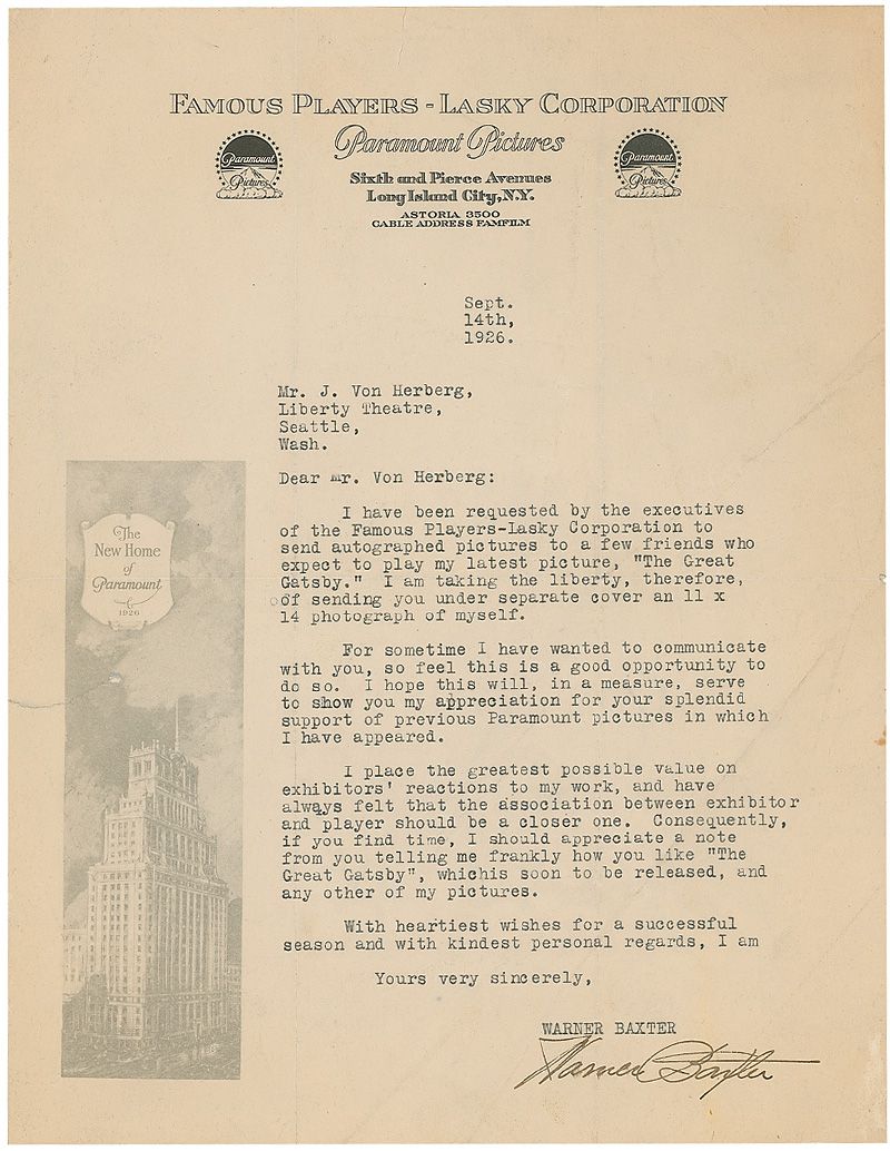TLS, one page, 8.5 x 11, Paramount Pictures letterhead, September 14, 1926. Letter to the manager of Seattle’s Liberty Theatre. In part: “I place the greatest possible value on exhibitors’ reactions to my work, and have always felt that the association between exhibitor and player should be a closer one. Consequently, if you find time, I should appreciate a note from you telling me frankly how you like ‘The Great Gatsby,’ which is soon to be released, and any other of my pictures.” In very good condition, with moderate scattered creasing, including one through last name of signature, partial separations along intersecting folds, some light feathering to signature, a uniform shade of toning, and tears to the top edge and left side.