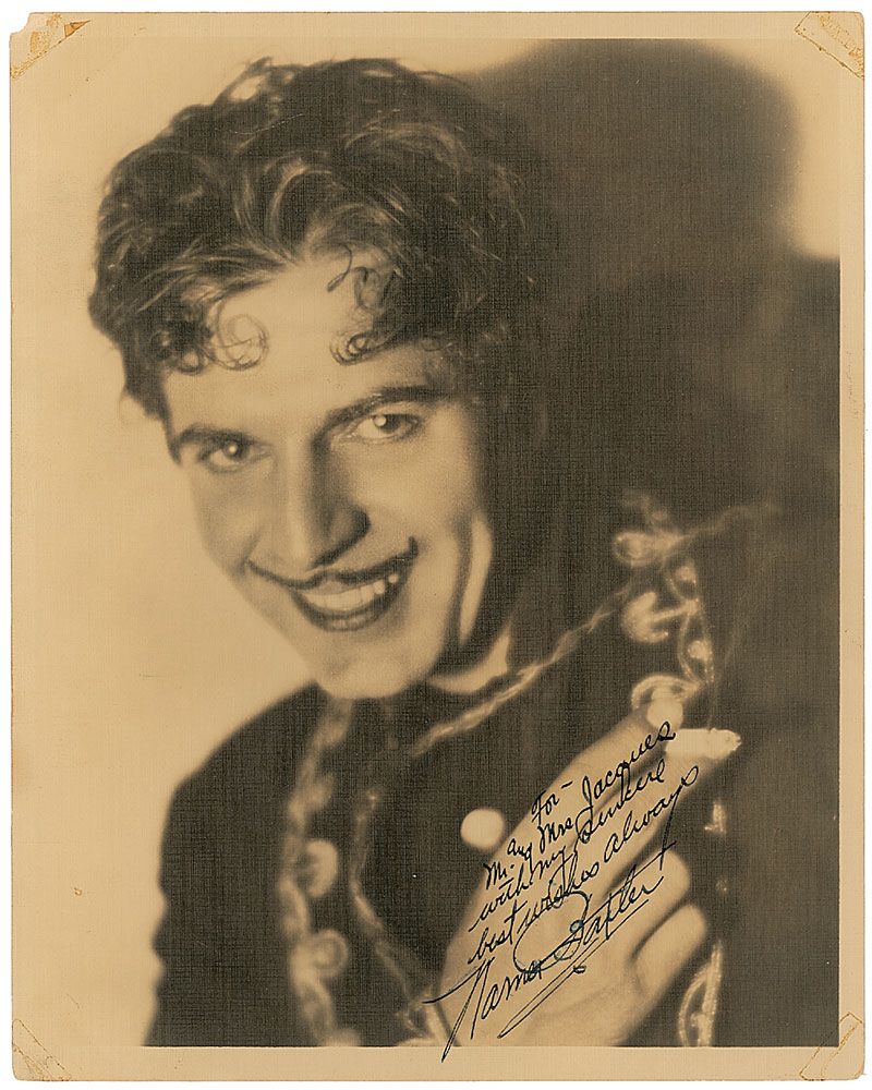 Vintage matte-finish 8 x 10 photo of Baxter in his Academy Award-winning role as the Cisco Kid, signed and inscribed in fountain pen, “For—Mr. and Mrs. Jacques, with my sincere best wishes always, Warner Baxter.” Mounting and old tape remnants to corner tips, a missing corner tip, a couple horizontal creases to left edge, and a bit of mild rippling, otherwise fine condition.