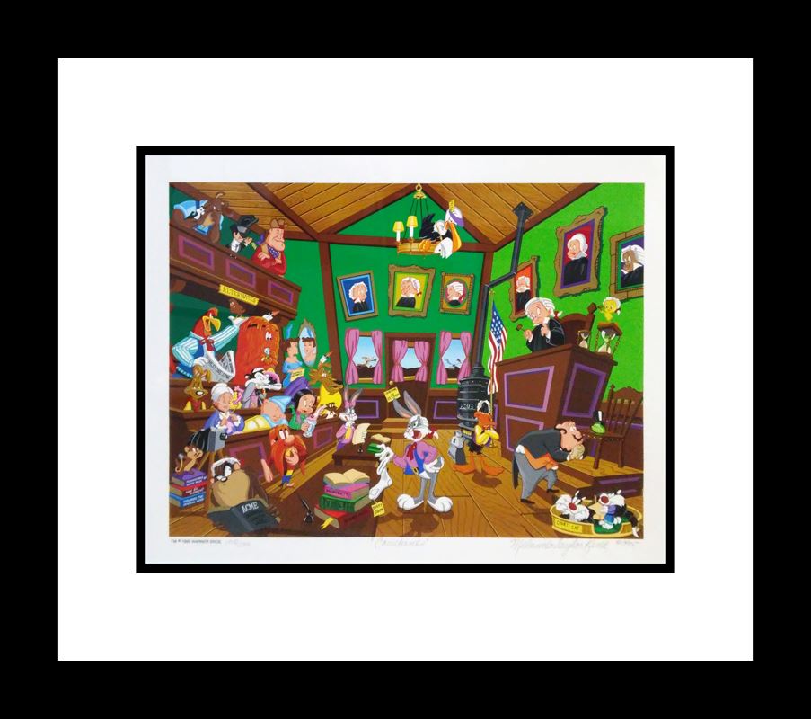 This Warner Bros. limited edition Melanie Taylor Kent lithograph entitled "Courtroom" features the Looney Tunes characters in a courtroom. This piece is framed and is signed by Melanie Taylor Kent . #105 out of 500