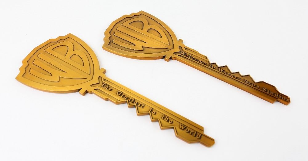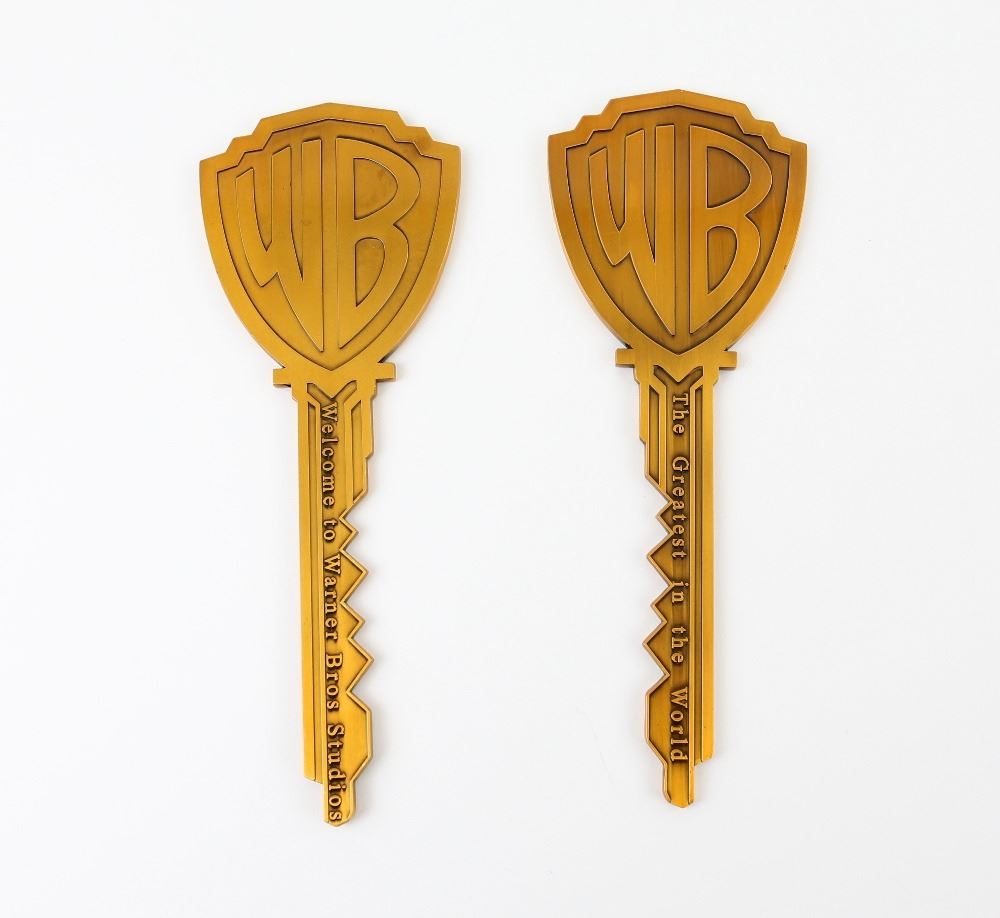Warner Bros. 'Key to the Studio,' Two oversized keys, made of metal, designed with the famous 'WB' logo one side Welcome to Warner Bros. Studios and the other The Greatest in the World; given to actors and other VIPs when they had an important association with the studio, 10 inches long (2)..
