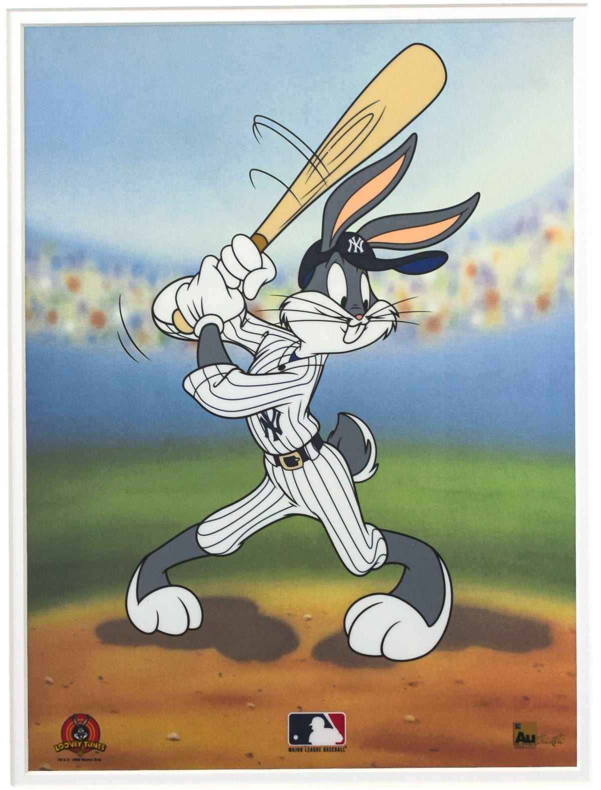 Artist: Warner Bros.. Medium: Sericel. Title: Bugs Bunny at Bat for the Yankees. Size (Unframed): 14" x 11". Size (Framed): 20" x 16". Certificate of Authenticity: Is included. Additional: Custom framed. Familiar characters, vibrant colors, and careful details make this a must-have sericel for both serious collectors and casual fans. "Bugs Bunny at Bat for the Yankees" is a limited edition sericel from Warner Bros. depicting the cartoon favorite, Bugs Bunny, winding up to hit one out of the park, marked with the MLB logo! Includes Certificate of Authenticity! Measures approx. 12" x 14" (with border); 11" x 14" (image).. Reference# 15540.