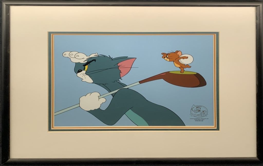 Warner Bros "Tee For Two" limited edition cel, numbered 1179/2500 on certificate. This piece has been professionally triple matted using acid free matting, and has been custom framed under glass. This piece is of Tom and Jerry playing golf, where they are both looking far away and Jerry is standing on Tom's golf club.