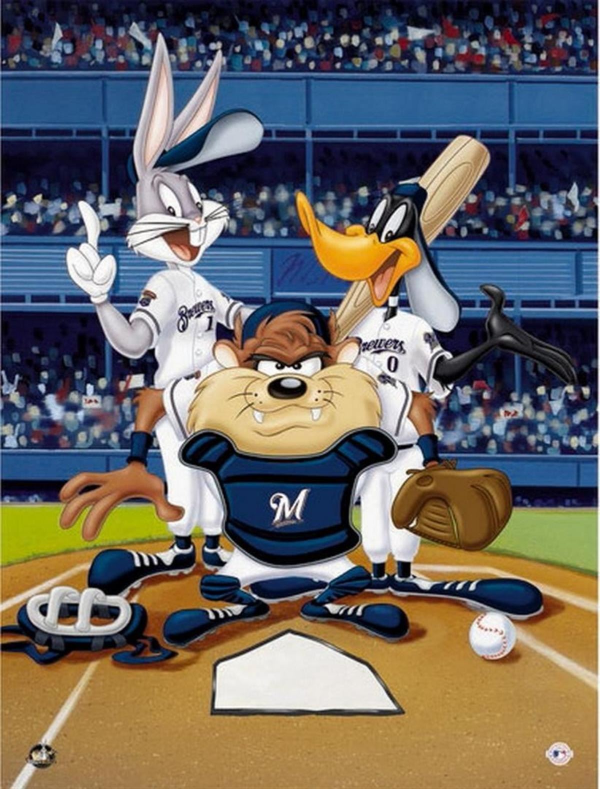 Artist: Warner Brothers - Title: At the Plate Brewers - Medium: Giclee on Fine Art Paper - Limited Edition: 500 - Image Size: Approximately 16 Inches x 12 inches - Paper Size: Approximately 20 inches x 16 inches - Framed: Unframed - Details: This work comes with a Warner Brothers Hologram for Authenticity - The three Warner Directors were expected to turn out ten six-minute cartoons each year, or one every five weeks! And, each director had his own lead designer, background artist, and a team of animators. Mel Blanc provided the common thread as the man of a thousand voices, and Carl Stalling is most recognized as the Music Director for the majority of the Warner Bros. shorts