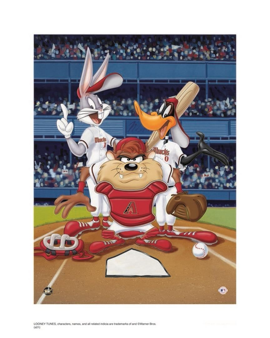 Artist: Warner Brothers - Title: At the Plate Diamondbacks - Medium: Giclee on Fine Art Paper - Limited Edition: 500 - Image Size: Approximately 16 Inches x 12 inches - Paper Size: Approximately 16 inches x 20 inches - Unframed - Details: This work comes with a Warner Brothers Hologram for Authenticity - The three Warner Directors were expected to turn out ten six-minute cartoons each year, or one every five weeks! And, each director had his own lead designer, background artist, and a team of animators. Mel Blanc provided the common thread as the man of a thousand voices, and Carl Stalling is most recognized as the Music Director for the majority of the Warner Bros. shorts