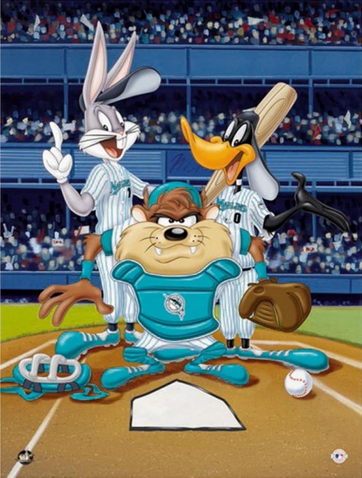 Artist: Warner Brothers - Title: At the Plate Marlins - Medium: Giclee on Fine Art Paper - Limited Edition: 500 - Image Size: Approximately 16 Inches x 12 inches - Paper Size: Approximately 20 inches x 16 inches - Framed: Unframed - Details: This work comes with a Warner Brothers Hologram for Authenticity - The three Warner Directors were expected to turn out ten six-minute cartoons each year, or one every five weeks! And, each director had his own lead designer, background artist, and a team of animators. Mel Blanc provided the common thread as the man of a thousand voices, and Carl Stalling is most recognized as the Music Director for the majority of the Warner Bros. shorts
