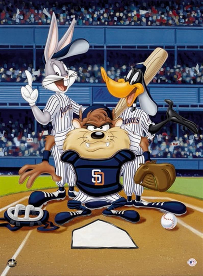 Artist: Warner Brothers - Title: At the Plate Padres - Medium: Giclee on Fine Art Paper - Limited Edition: 500 - Image Size: Approximately 16 Inches x 12 inches - Paper Size: Approximately 16 inches x 20 inches - Framed: Unframed - Details: This work comes with a Warner Brothers Hologram for Authenticity - The three Warner Directors were expected to turn out ten six-minute cartoons each year, or one every five weeks! And, each director had his own lead designer, background artist, and a team of animators. Mel Blanc provided the common thread as the man of a thousand voices, and Carl Stalling is most recognized as the Music Director for the majority of the Warner Bros. shorts
